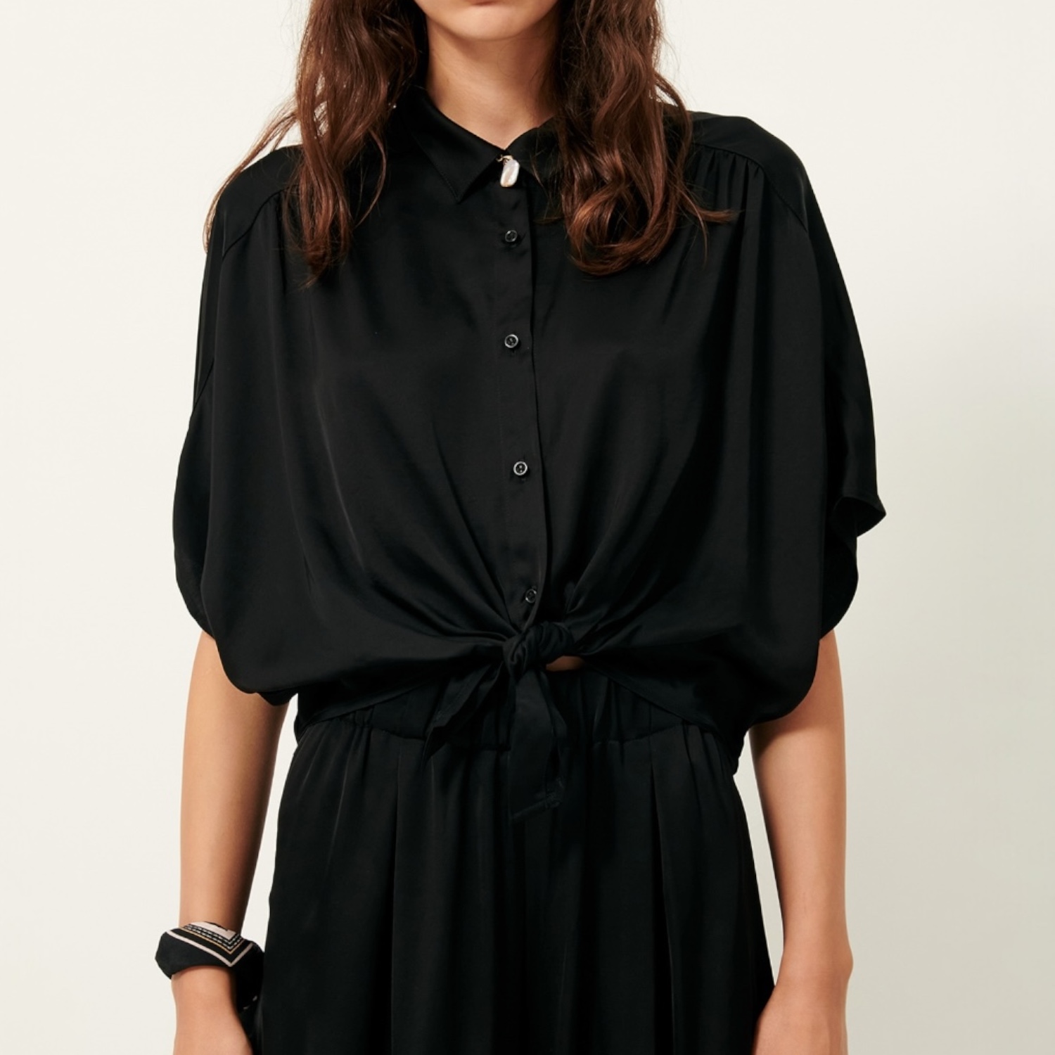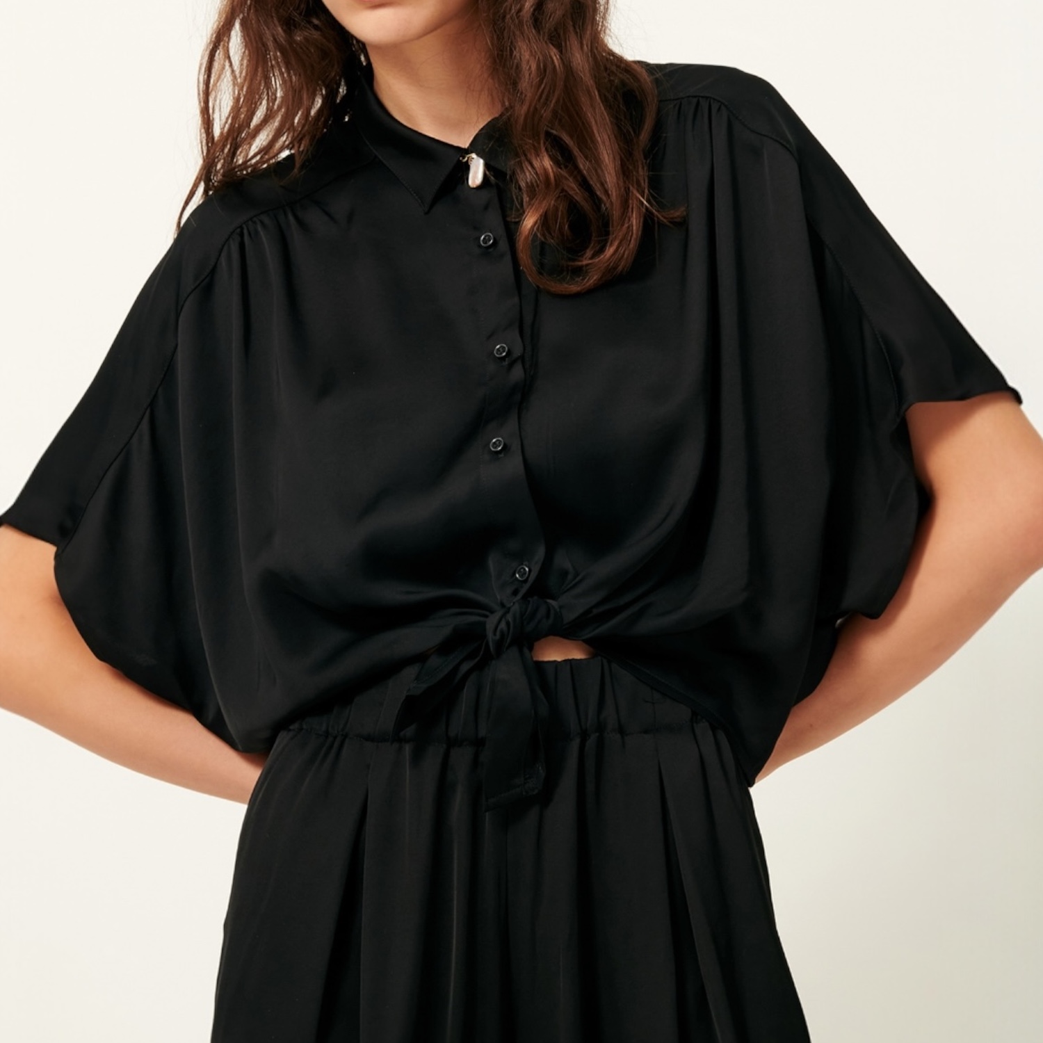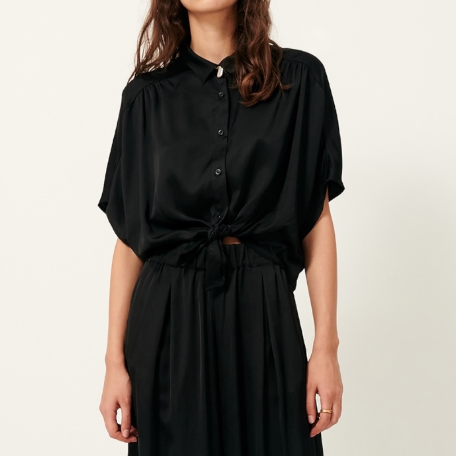 De Alfassa blouse in de kleur Night Black van het label Franse label Sessùn. Deze prachtige blouse met aangeknipte mouw is gemaakt van een soepel zwart satijnen Ecovero viscose. Verder heeft het een kraag en een knoopsluiting aan de voorzijde, waar je aan de onderzijde de blouse knoopt met een strik. Aan de achterzijde zit een tunneltje met breed elastiek voor een boxy effect.