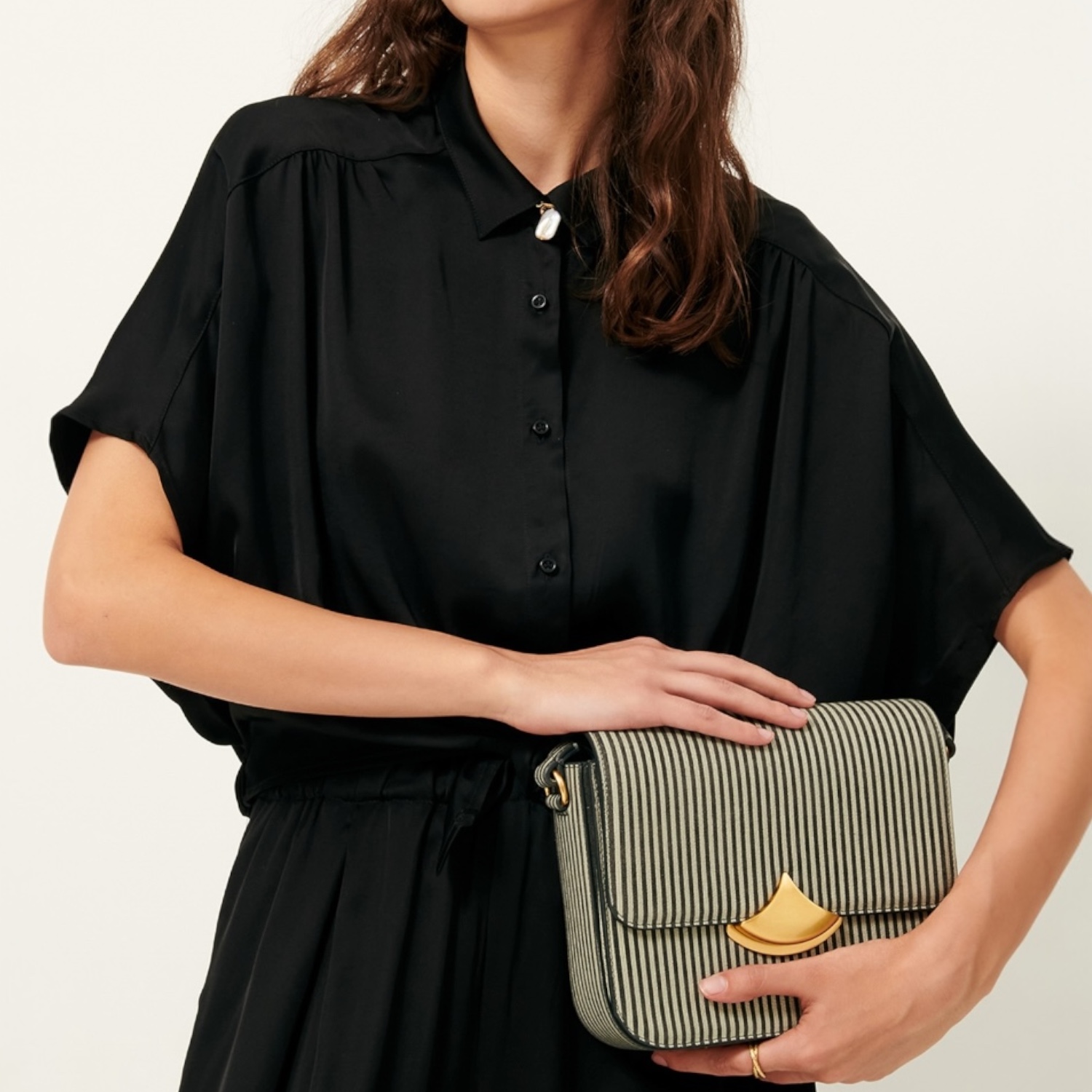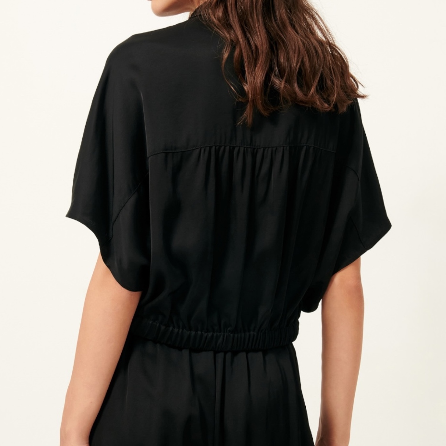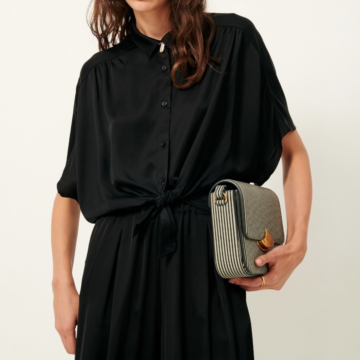 De Alfassa blouse in de kleur Night Black van het label Franse label Sessùn. Deze prachtige blouse met aangeknipte mouw is gemaakt van een soepel zwart satijnen Ecovero viscose. Verder heeft het een kraag en een knoopsluiting aan de voorzijde, waar je aan de onderzijde de blouse knoopt met een strik. Aan de achterzijde zit een tunneltje met breed elastiek voor een boxy effect.