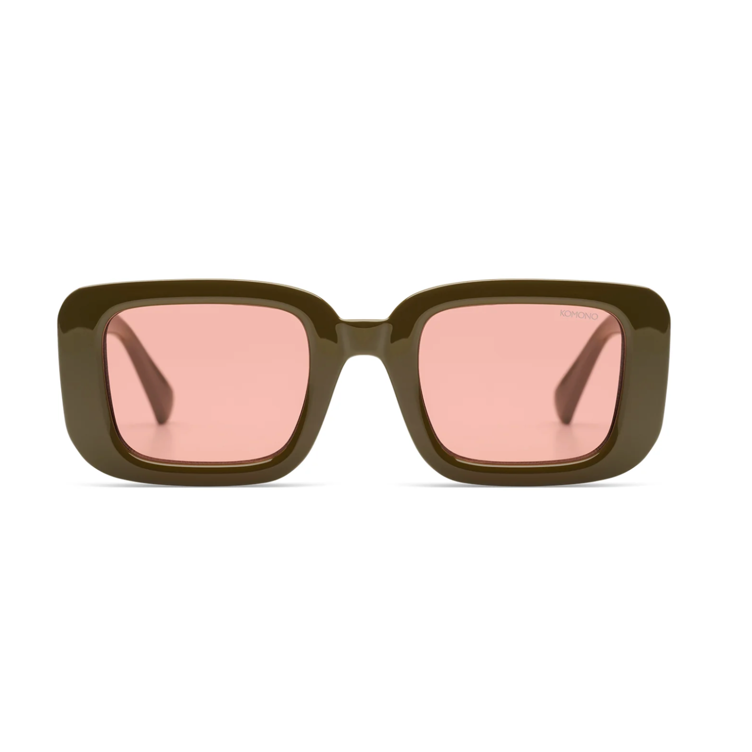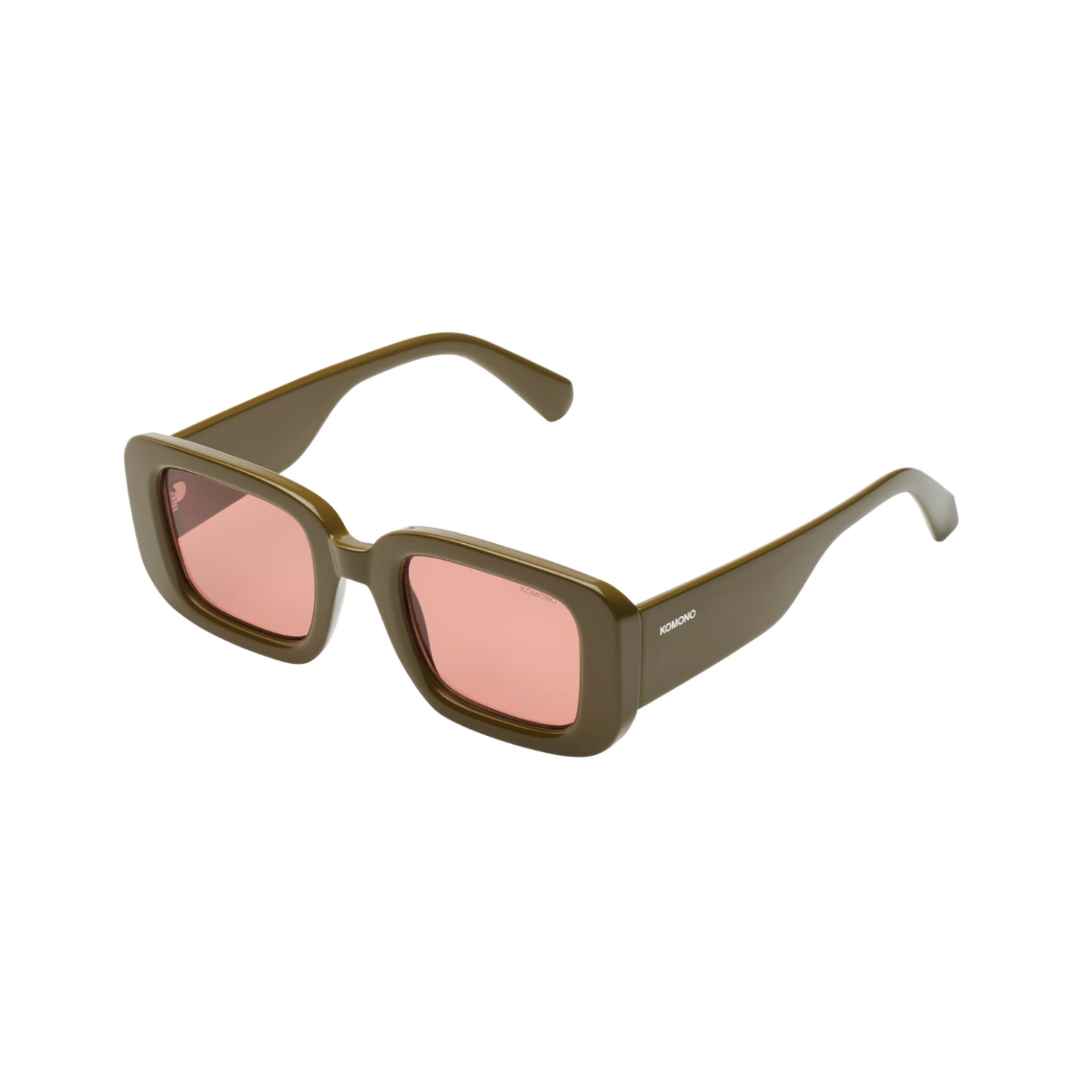 De olijfgroene rechthoekige zonnebril met roze glazen Avery Hazel van Komono is een verfijnde combinatie van natuurlijke tinten en modern design. Het matte, hazelgroene montuur geeft deze zonnebril een rustige en aardse uitstraling, terwijl de strakke rechthoekige vorm zorgt voor een eigentijds en krachtig silhouet. Daardoor voelt dit model minimalistisch aan, maar allesbehalve saai.