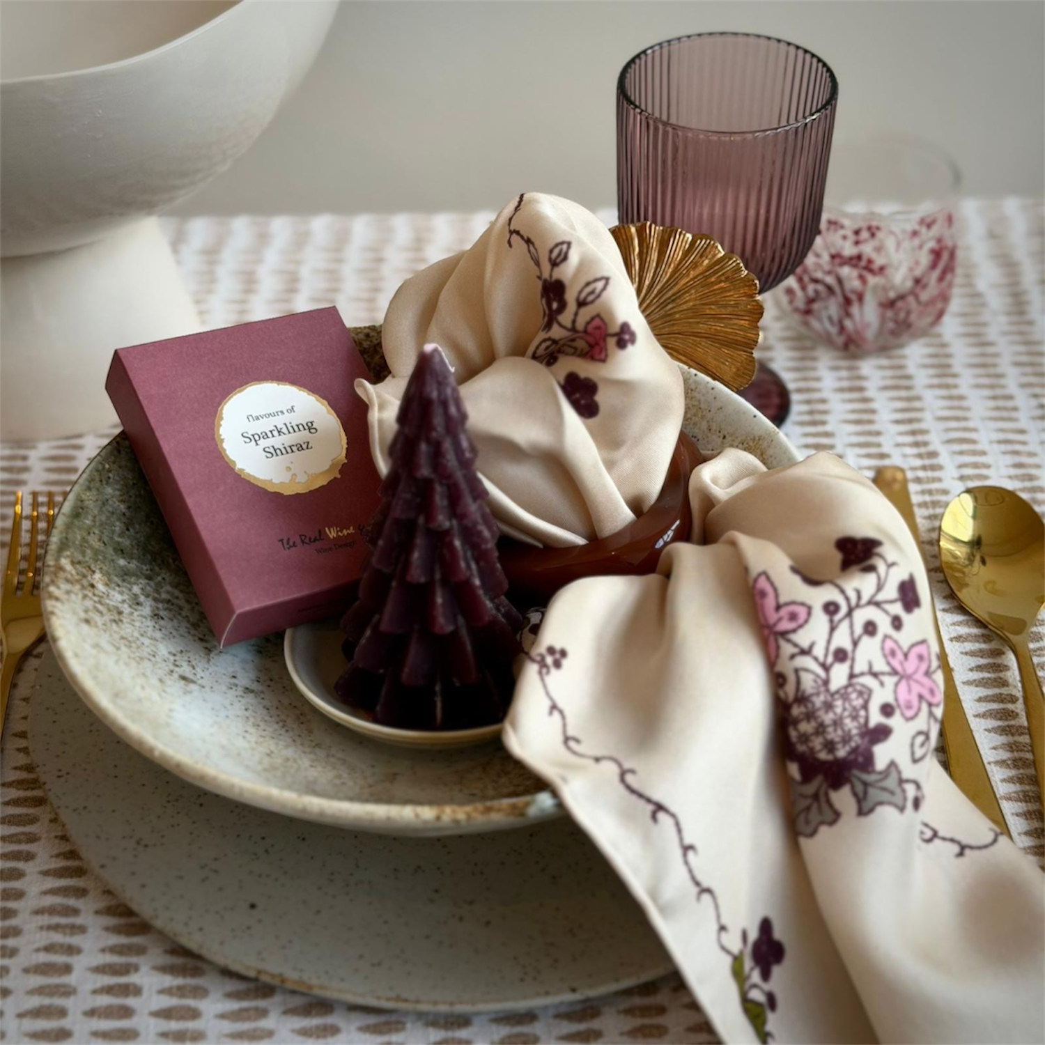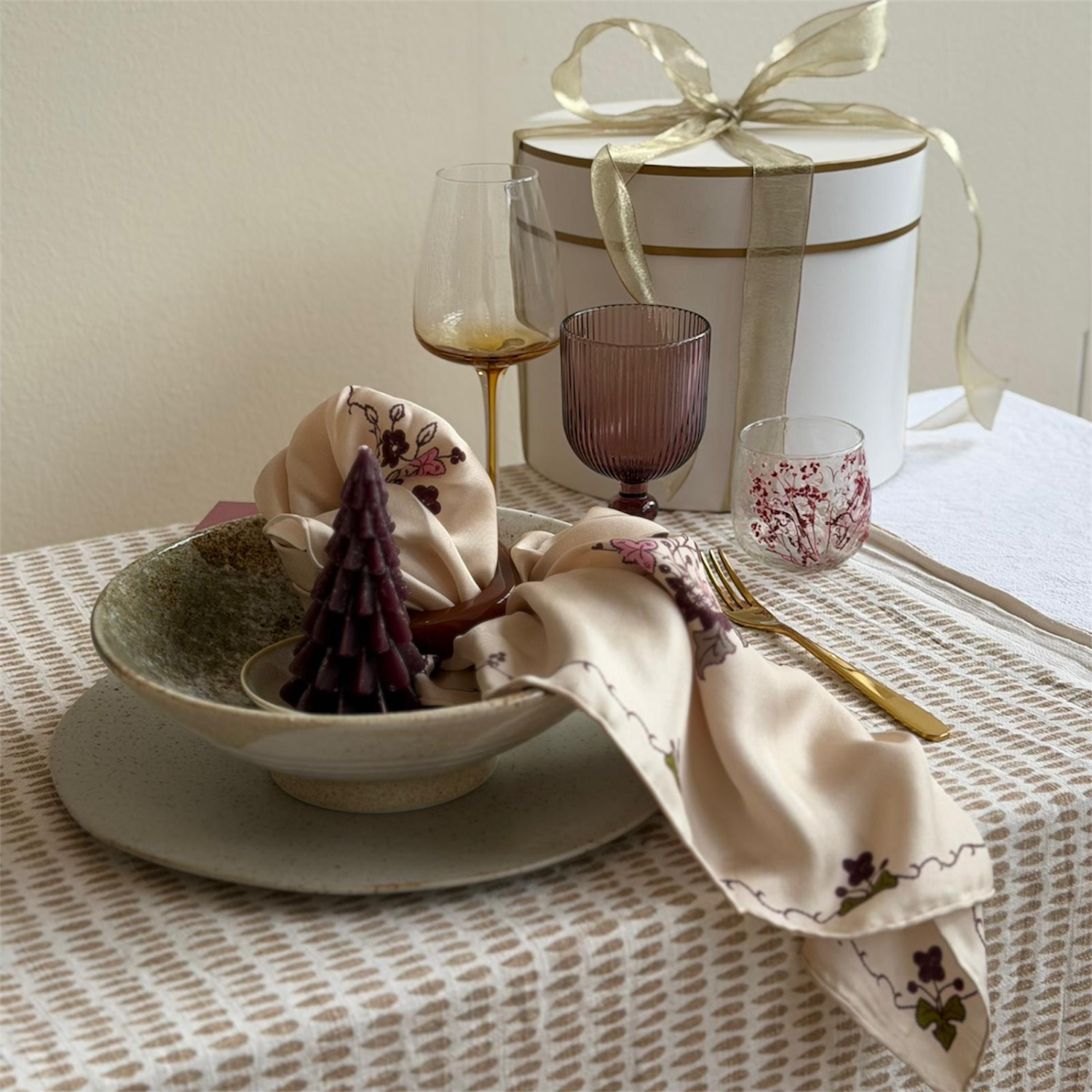 Verder heeft het ontwerp een minimalistische bloemenprint in warme bordeaux- en groentinten, die mooi afsteekt tegen de zachte crèmekleurige achtergrond. De natuurlijke glans van de zijde zorgt voor een luxe uitstraling en een soepel vallende stof die prettig aanvoelt op de huid.