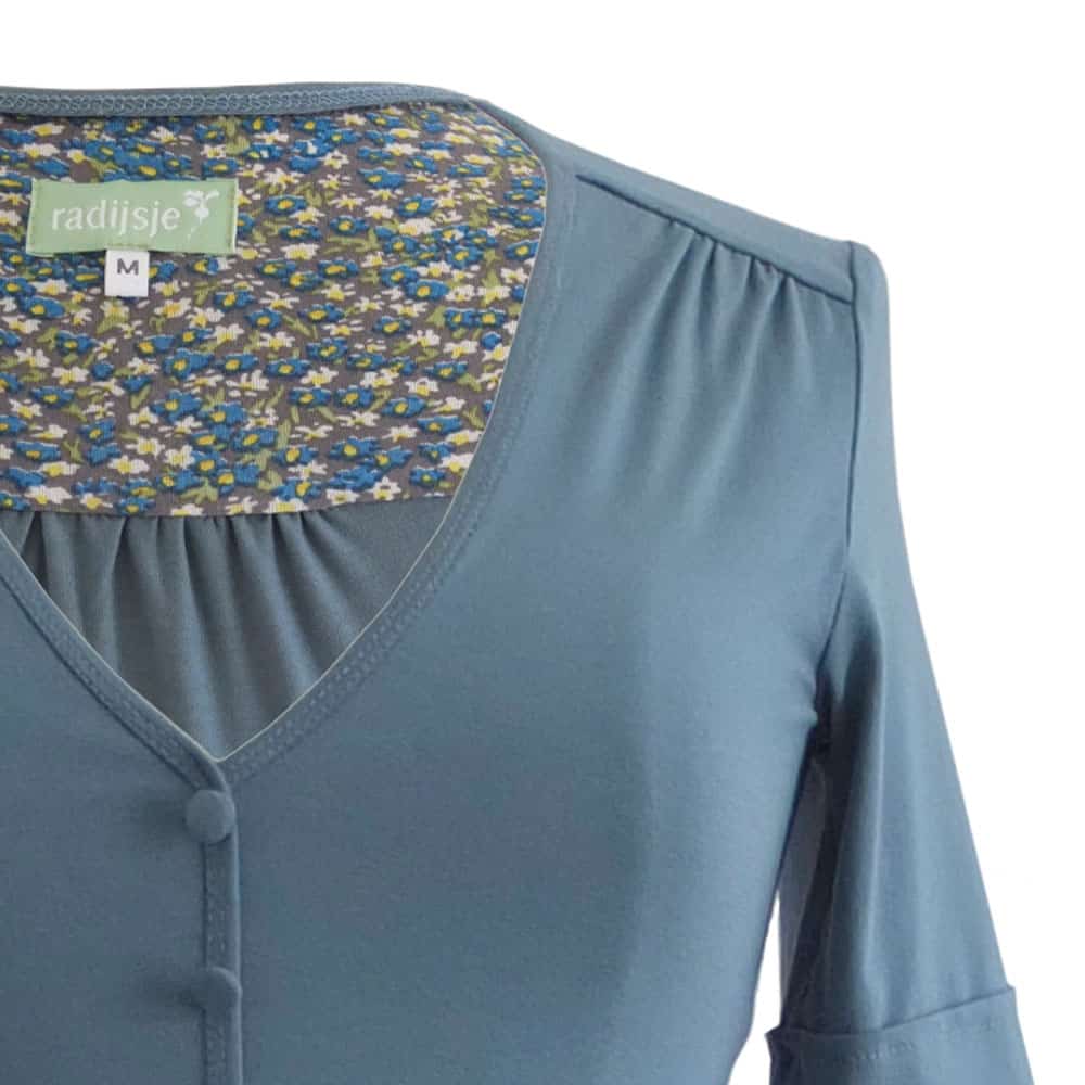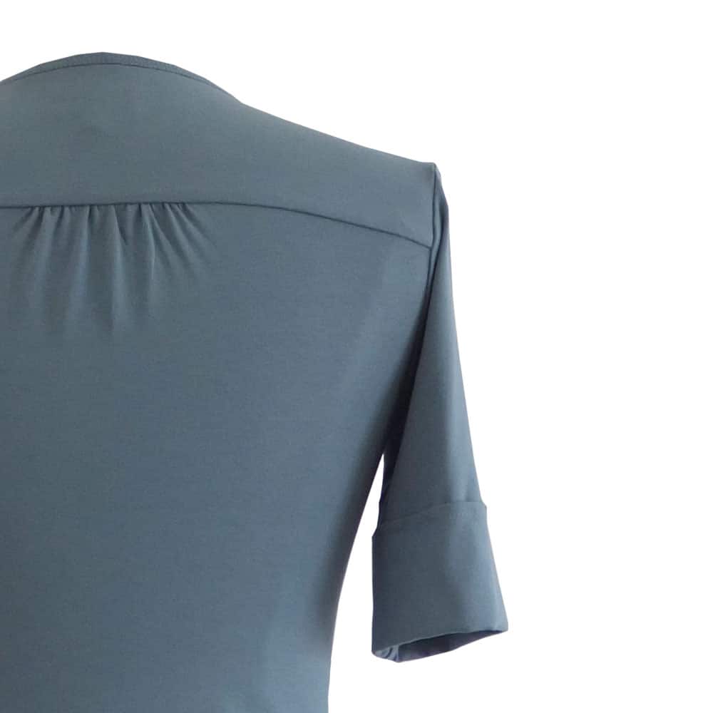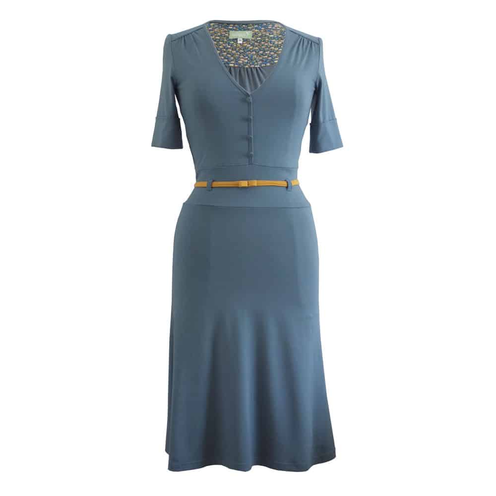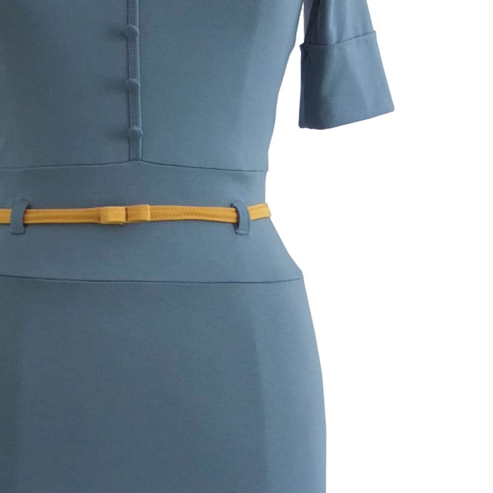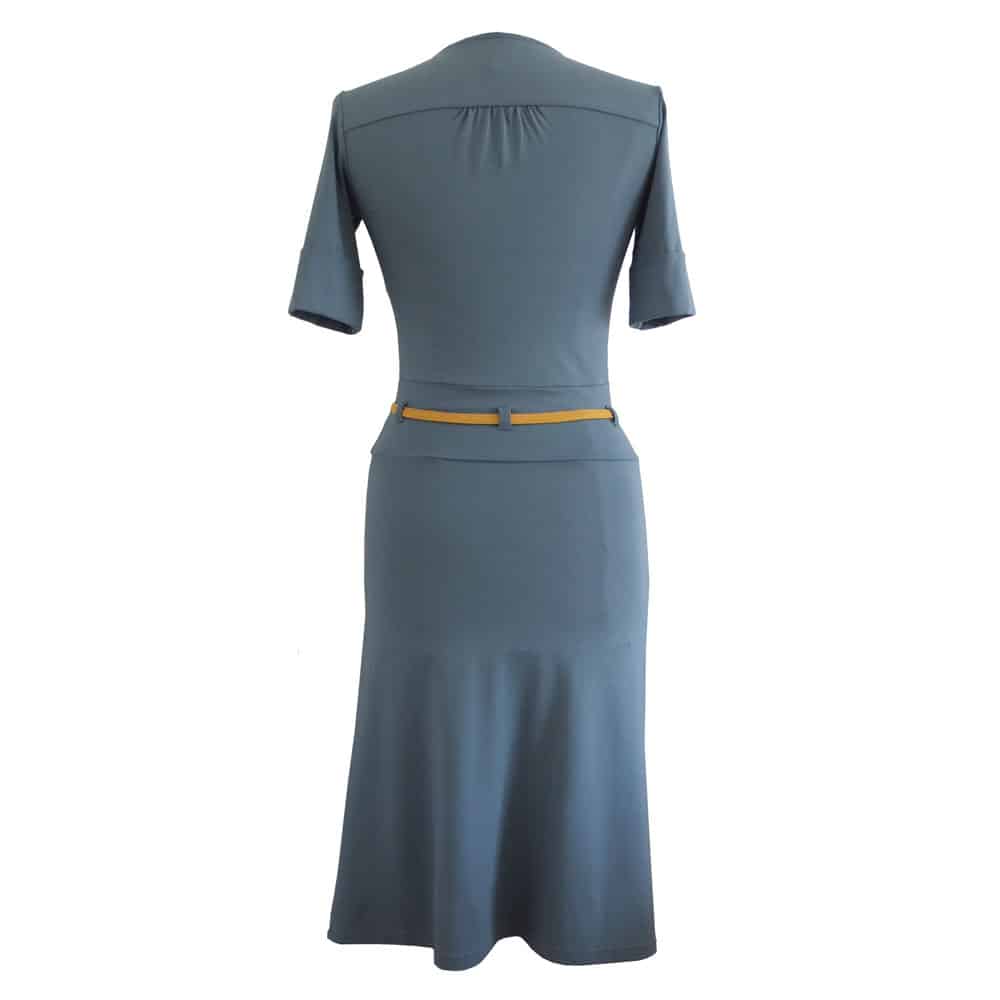 Grijsblauwe jurk met gerend rokdeel, V-hals, kleine stofknoopjes op middenvoor en een mouwtje met omslag. Het okergele vaste ceintuurje accentueert mooi de taille. De roklengte is bij gemiddelde lengte iets boven de knie. Het contrasterend stofje aan de binnenzijde kan verschillen. Wij zoeken er een mooi bijpassende tegenstof bij.