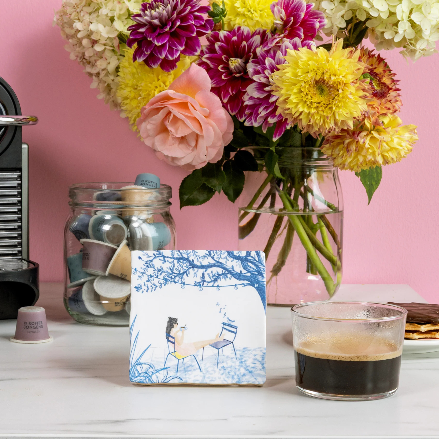 De tegel is gemaakt van hoogwaardig keramiek en heeft een zachte glans. Je kunt hem ophangen aan de muur of neerzetten in een tegelhouder, bijvoorbeeld in de keuken, werkkamer of koffienis. Daardoor is hij niet alleen decoratief, maar ook verhalend: een dagelijkse herinnering om even te vertragen.