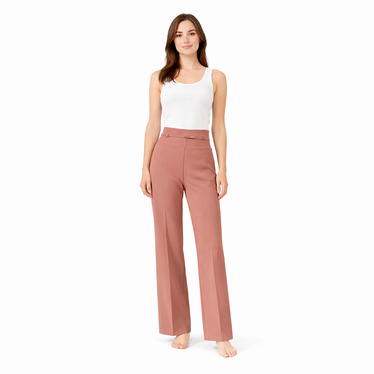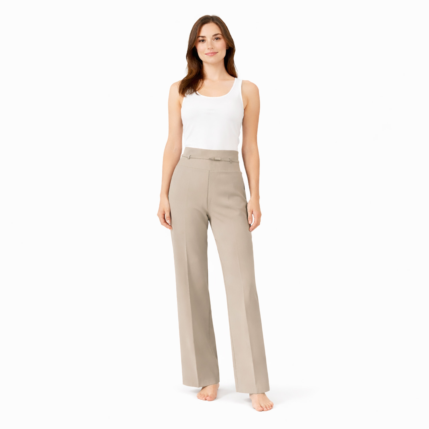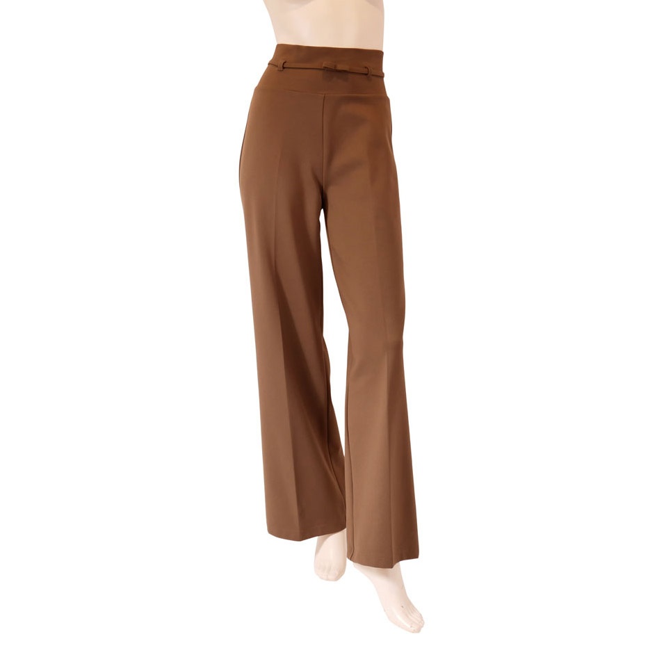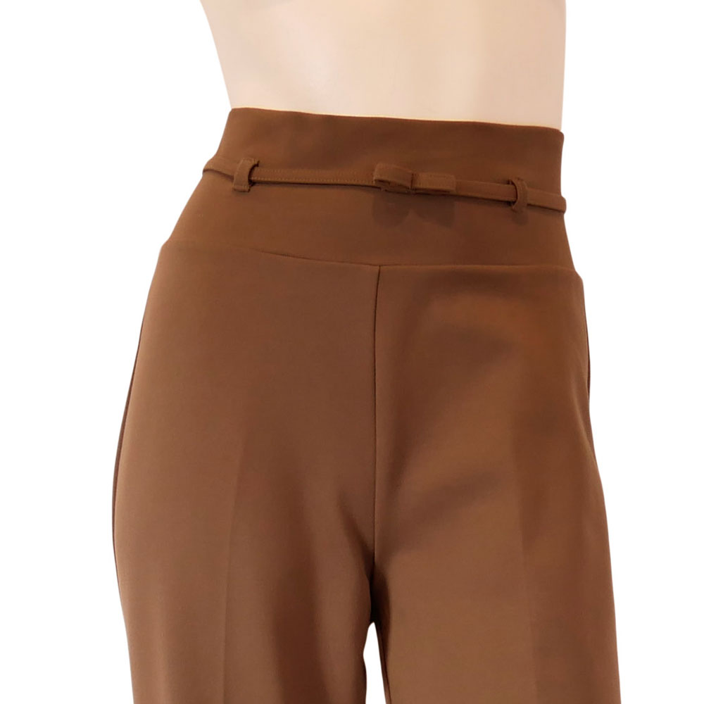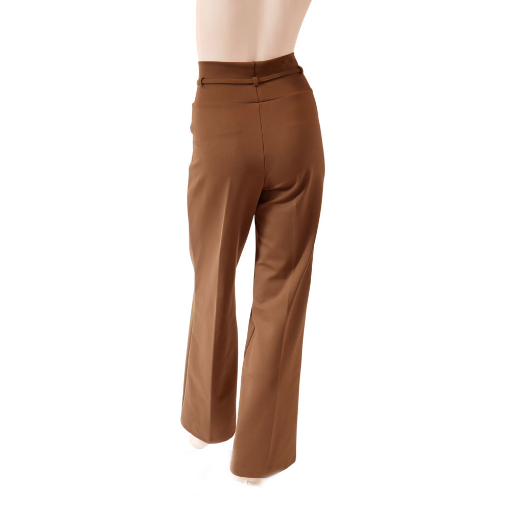 Deze broek met wijde pijp draag je sportief met een sneaker of wat meer gekleed met een hakje eronder. Het is een model welke wat strakker rond de taille/heup zit en daardoor erg mooi afkleedt. Het is gemaakt van een stevig iets rekbaar materiaal in een viscose/polyamide blend. In de taille 5 lusjes met daar doorheen een vast ceintuurtje van dezelfde stof.