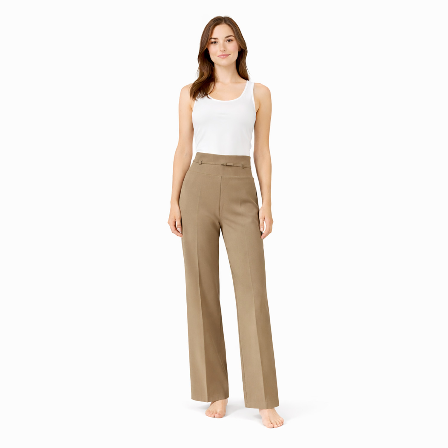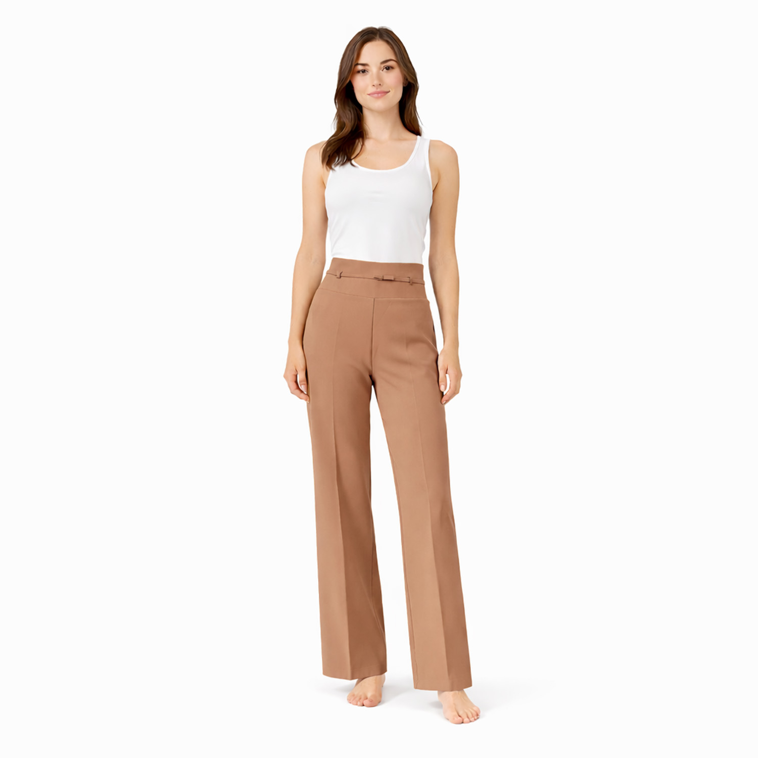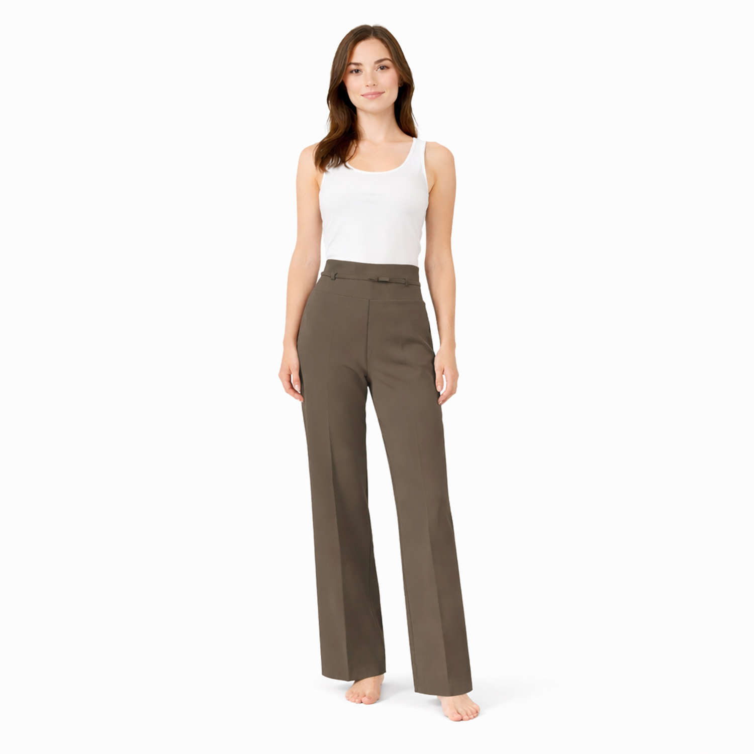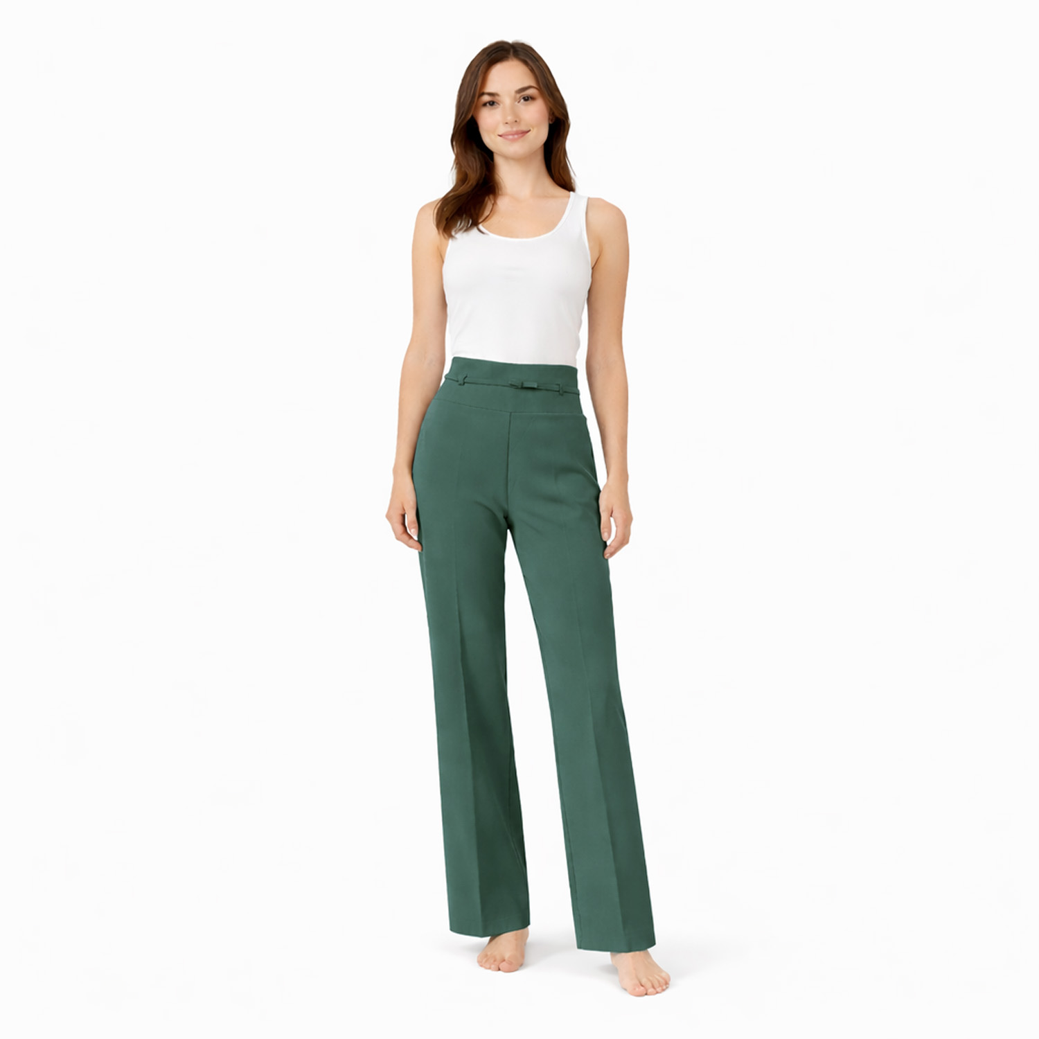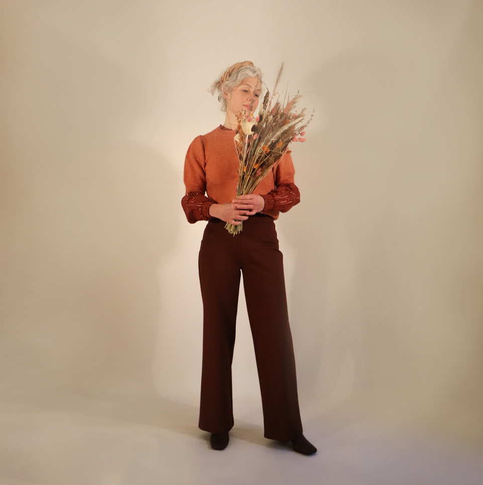 Deze broek met wijde pijp draag je sportief met een sneaker of wat meer gekleed met een hakje eronder. Het is een model welke wat strakker rond de taille/heup zit en daardoor erg mooi afkleedt. Het is gemaakt van een stevig iets rekbaar materiaal in een viscose/polyamide blend. In de taille 5 lusjes met daar doorheen een vast ceintuurtje van dezelfde stof.