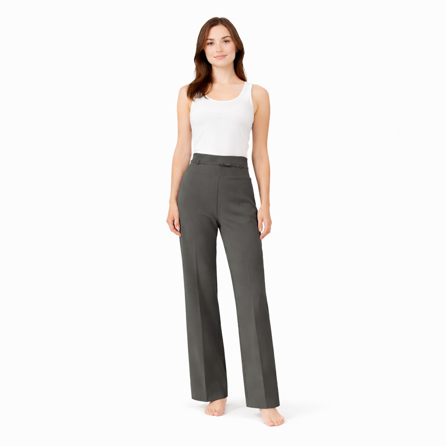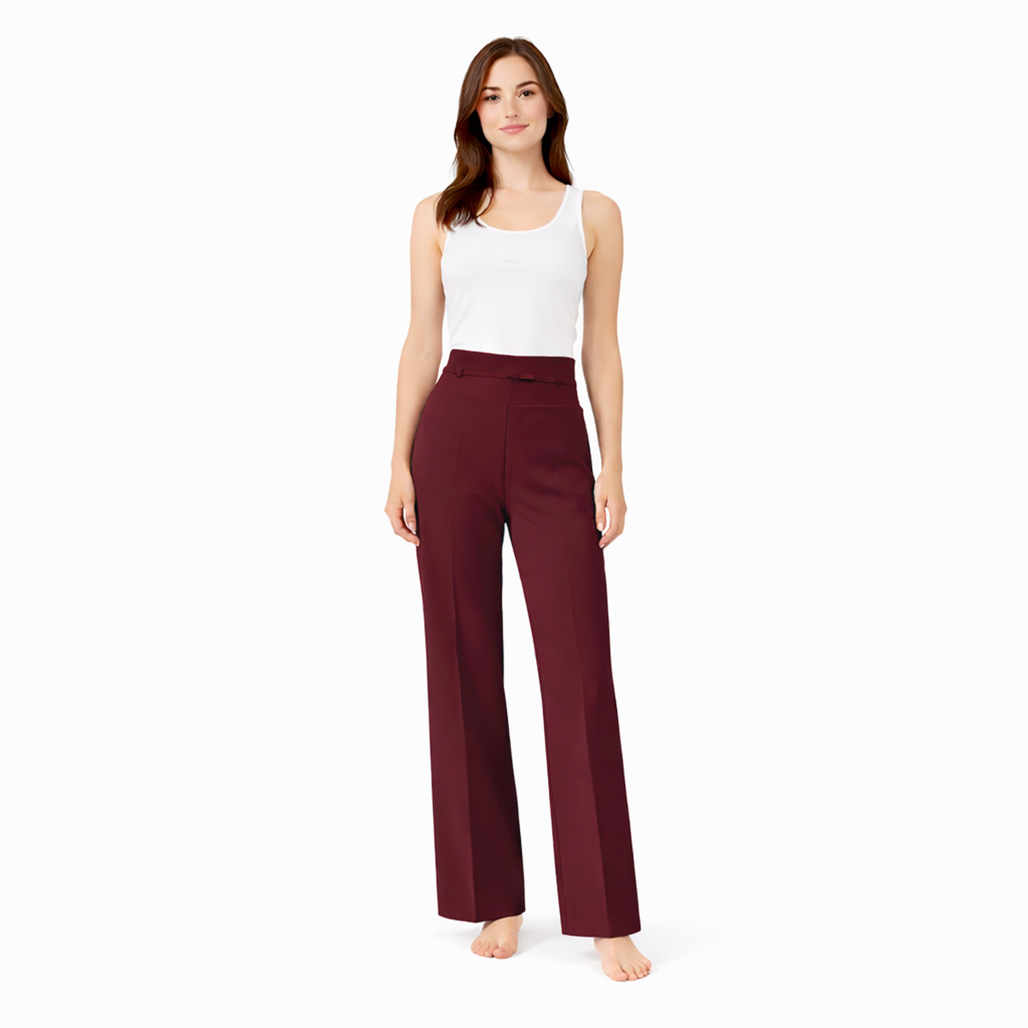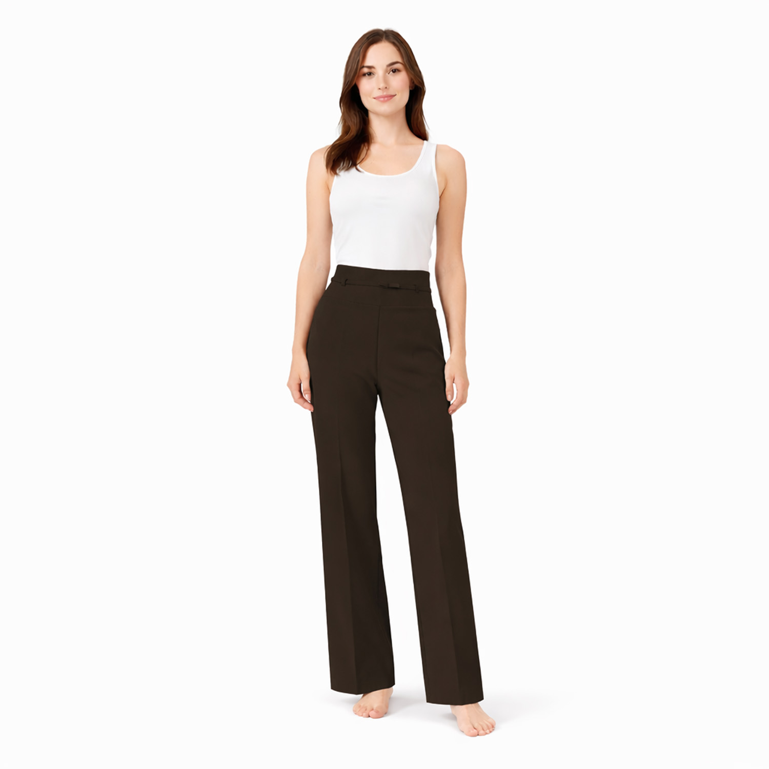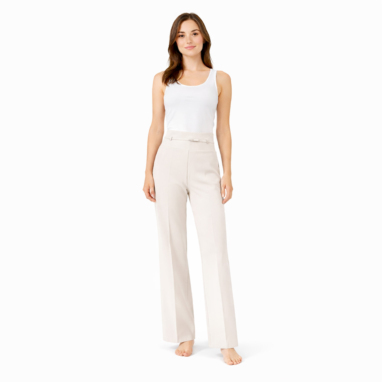 Deze broek met wijde pijp draag je sportief met een sneaker of wat meer gekleed met een hakje eronder. Het is een model welke wat strakker rond de taille/heup zit en daardoor erg mooi afkleedt. Het is gemaakt van een stevig iets rekbaar materiaal in een viscose/polyamide blend. In de taille 5 lusjes met daar doorheen een vast ceintuurtje van dezelfde stof.