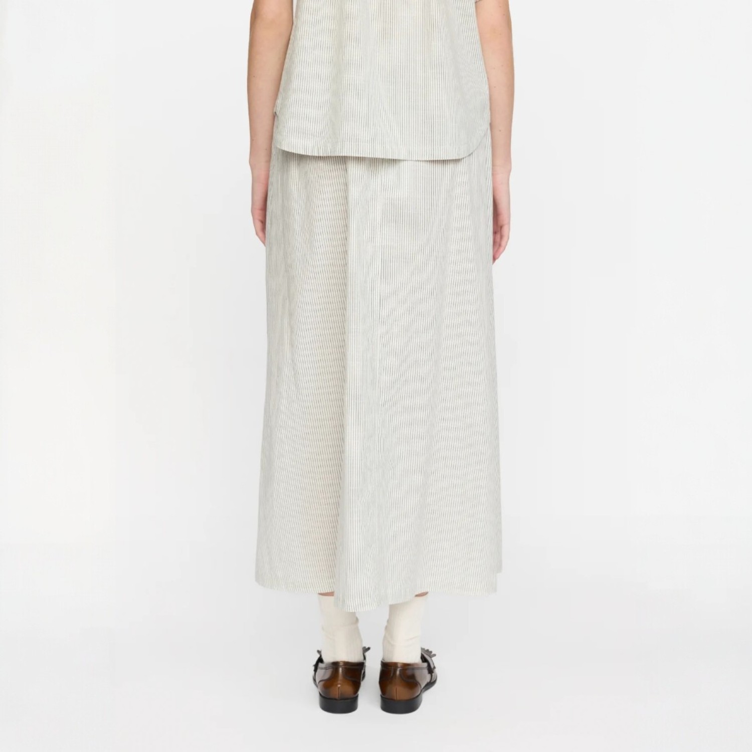 De rok heeft een mooie, vloeiende pasvorm die het figuur volgt zonder te strak te zitten, waardoor hij perfect is voor zowel dagelijkse outfits als meer geklede gelegenheden. Door de tijdloze kleur en eenvoudige snit is de Ebbi Midi Skirt een must-have voor een stijlvolle en comfortabele look.