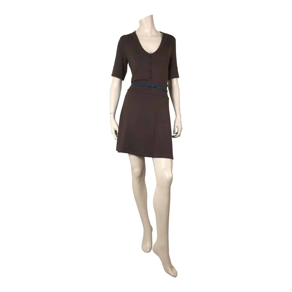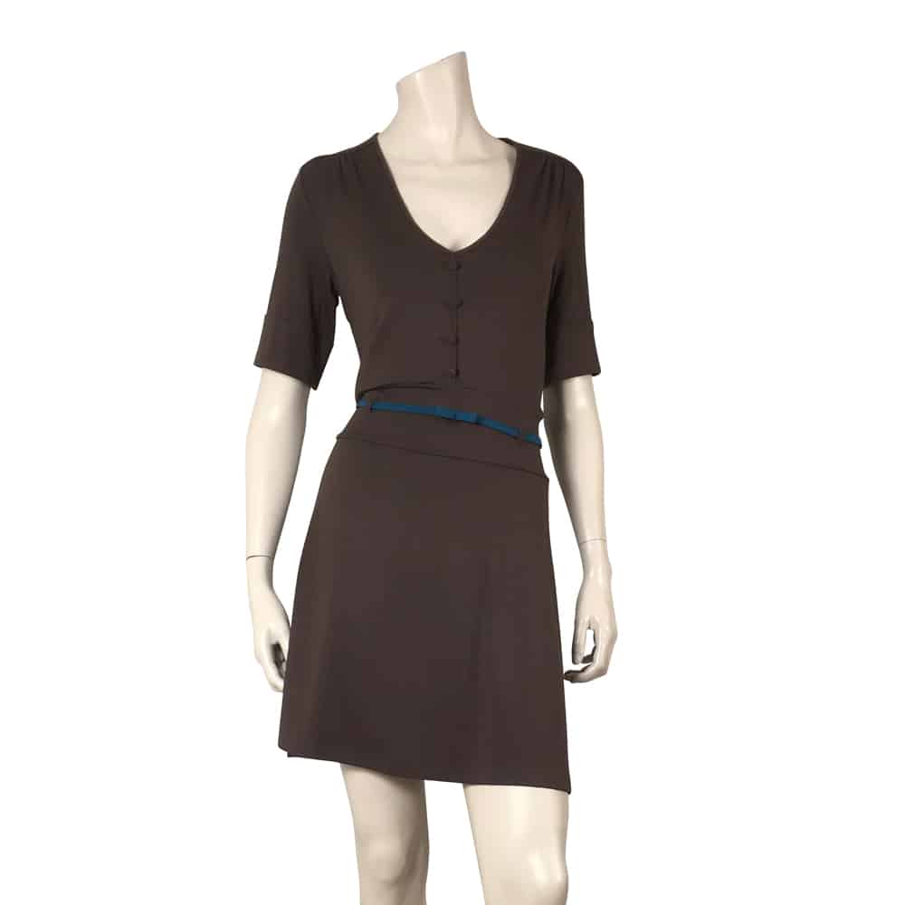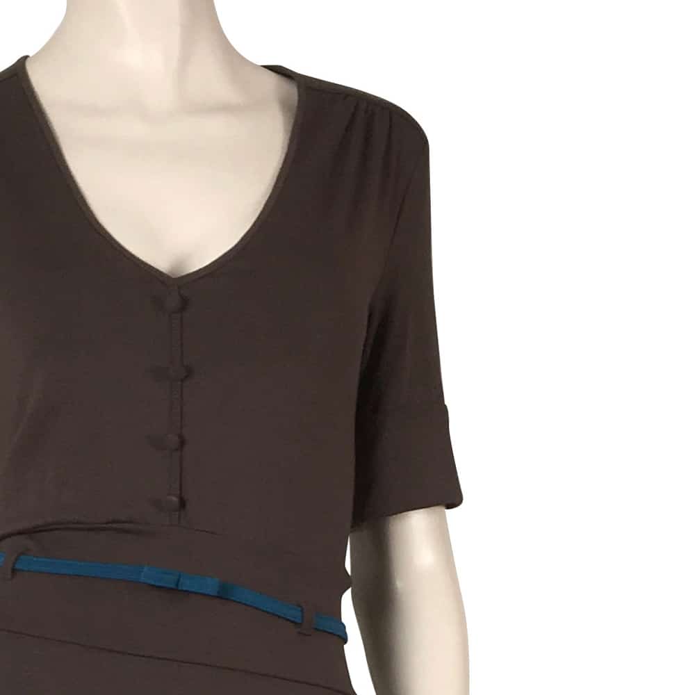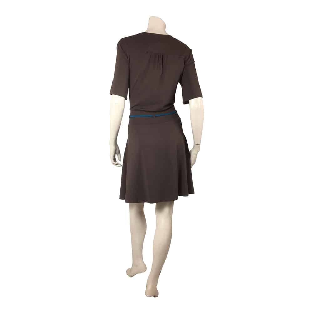 Deze donker bruine jurk heeft een halve cirkelrok als rokdeel, V-hals, kleine stofknoopjes op middenvoor en een mouwtje met omslag. Het petrolkleurige vaste ceintuurje draag je in de taille. Dit model heeft anders dan de Longena met de gerende rok, een rok die iets wijder is (de halve cirkelrok).