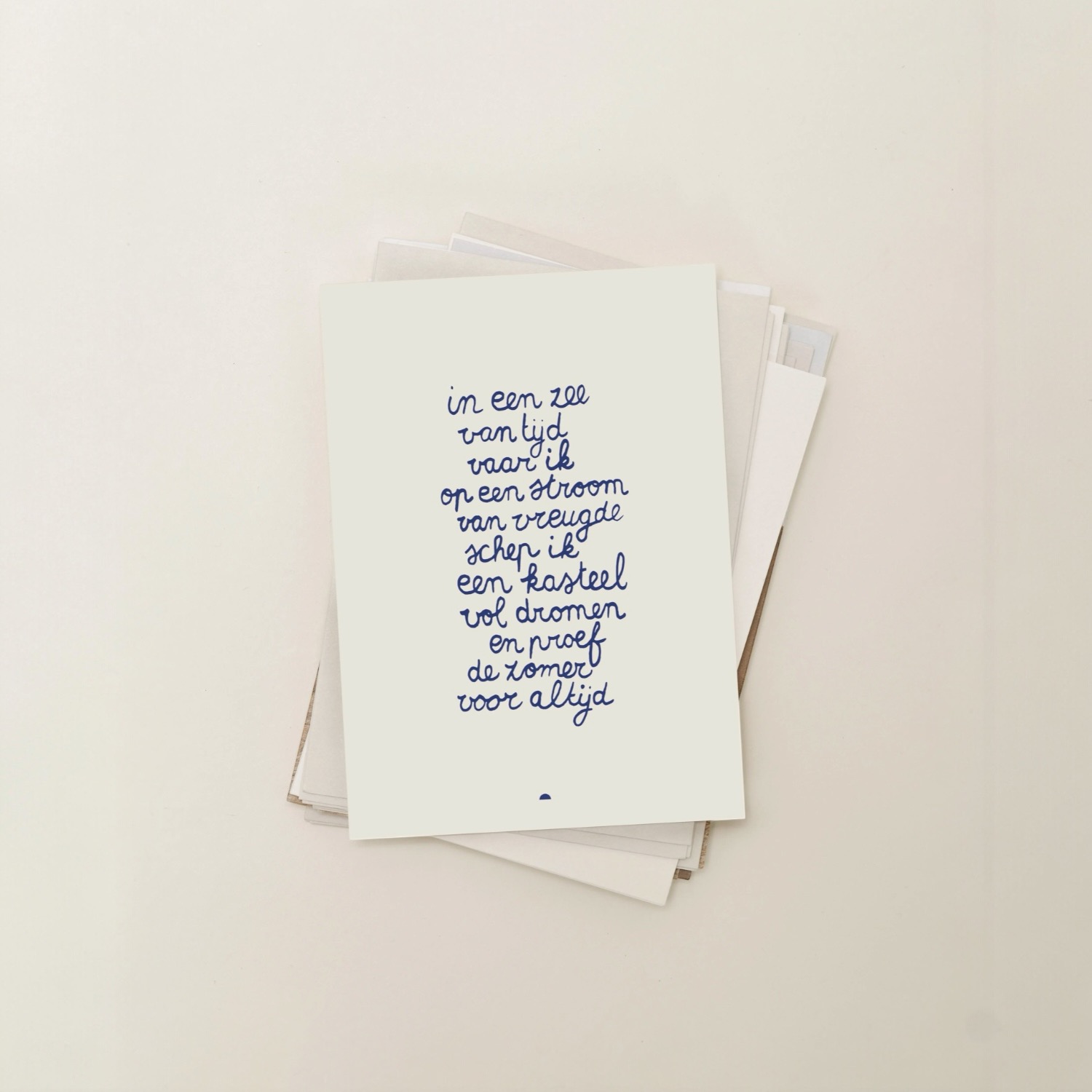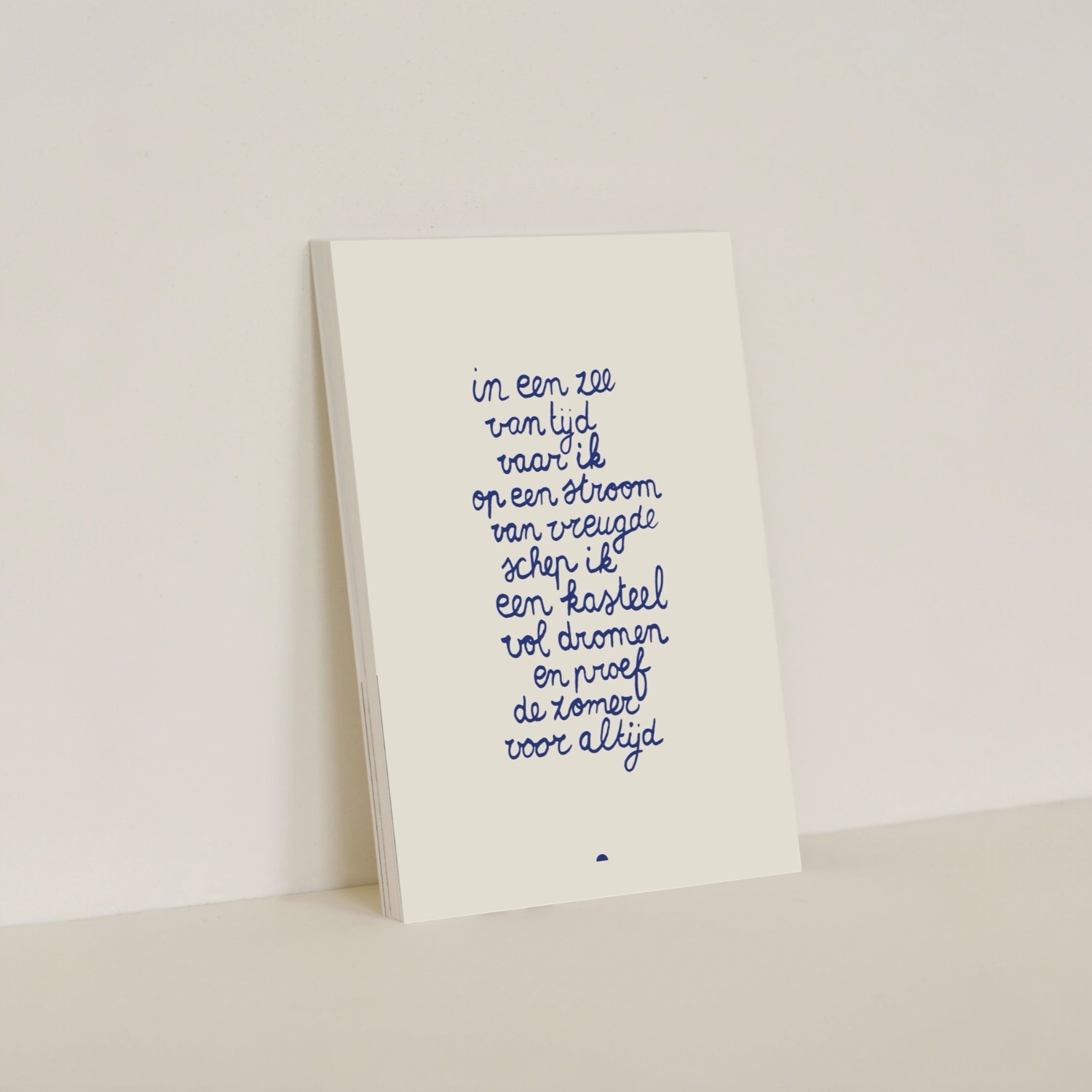 Wenskaart In een zee van tijd, van Sâlt + Flor, is een kaart met een gedicht. Dit gedicht is een ode aan het kinderlijke plezier en de verbeelding die opkomt als je je overgeeft aan het moment. Het gaat over ruimte en vrijheid, lichtheid en speelsheid. “Een kasteel vol dromen” symboliseert creativiteit en verlangen, terwijl de zomer wordt geproefd als iets dat blijft — een gevoel dat je meeneemt. Een dromerige, poëtische herinnering aan hoe het voelt om echt te leven in het nu.