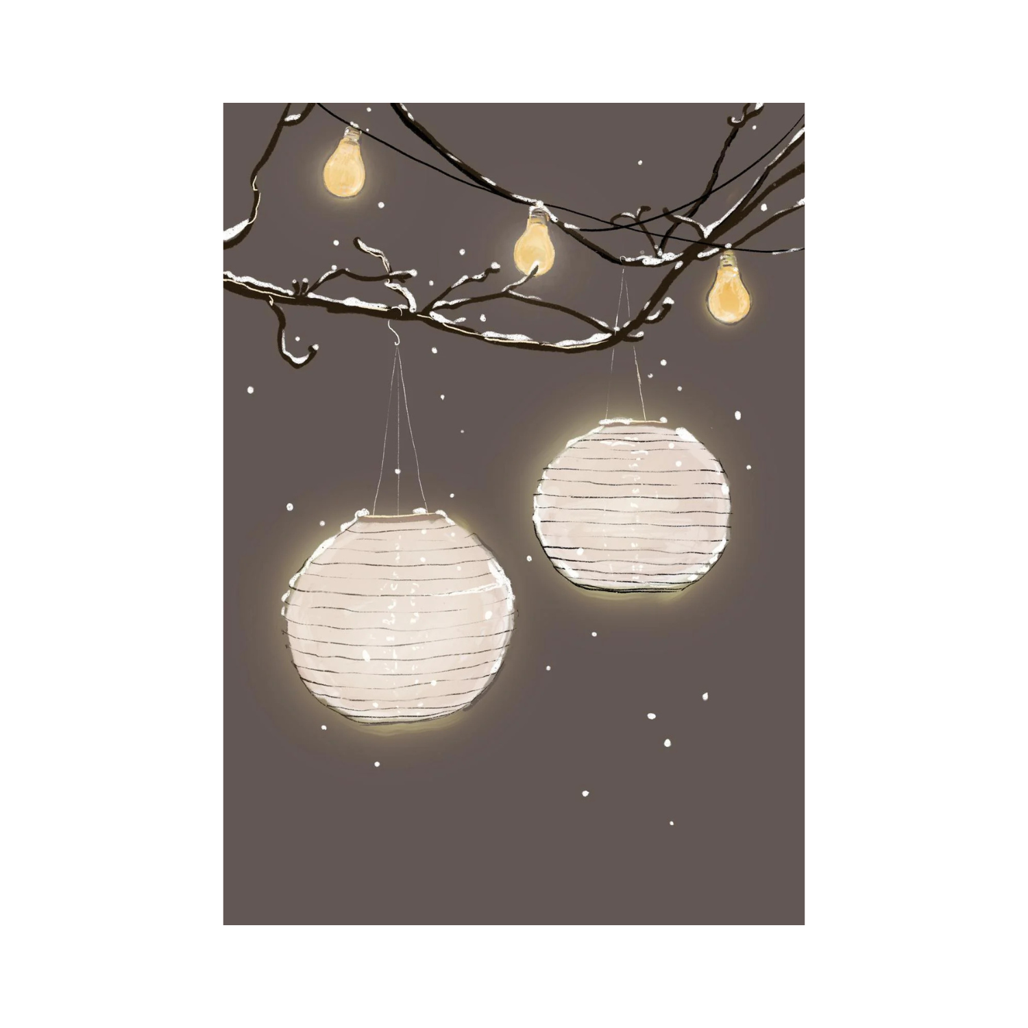 Deze sfeervolle illustratie van Studio Veldman vangt de verstilde magie van een winteravond waarop licht en stilte samenkomen. Twee Japanse papieren lantaarns hangen aan een met sneeuw bedekte tak, terwijl daarboven warme lichtpeertjes een zachte gloed verspreiden. De donkere achtergrond versterkt de helderheid van het licht, waardoor de kaart een bijna poëtische rust uitstraalt. Het is een ontwerp dat zowel elegant als sereen oogt, typisch voor de minimalistische stijl van Andrea Veldman.