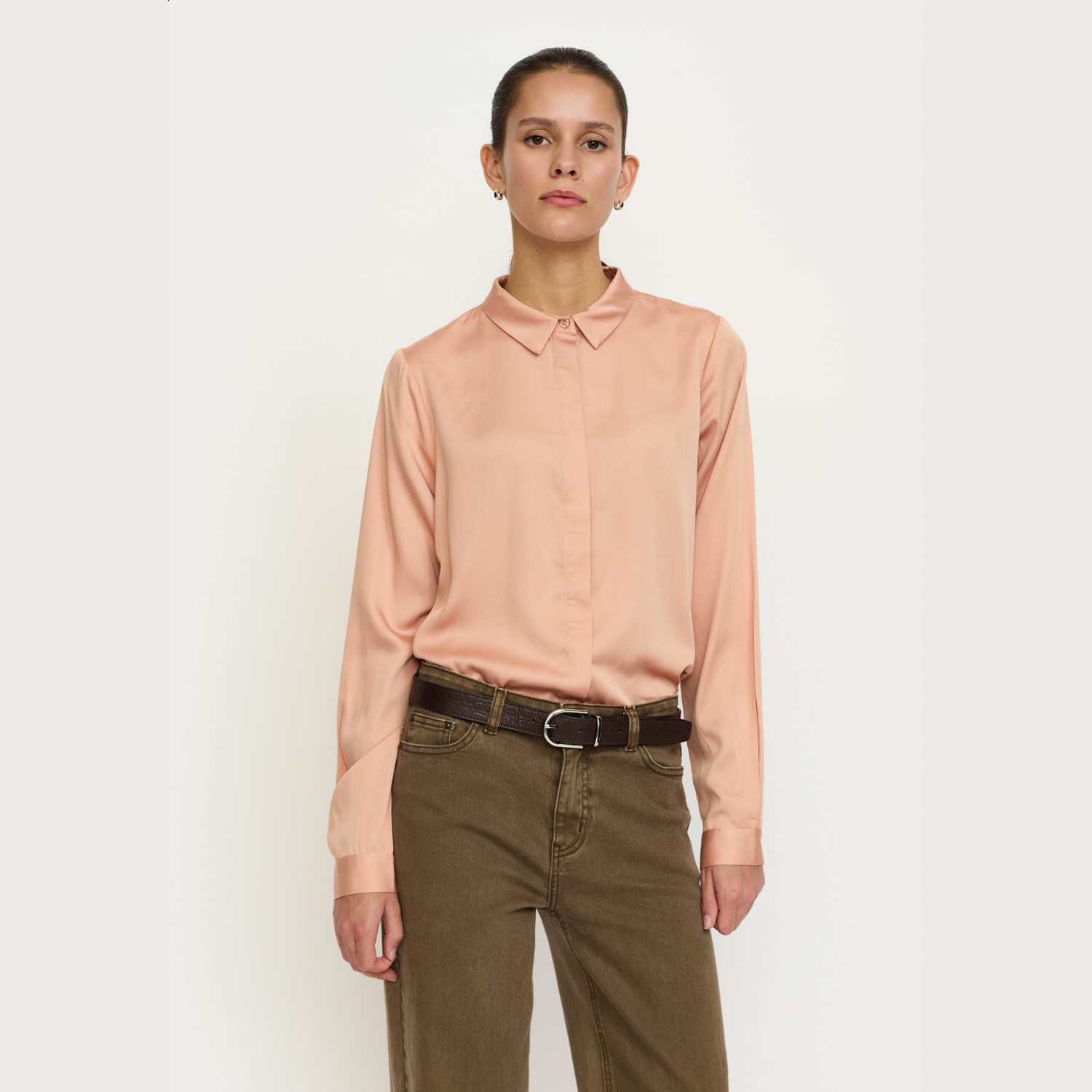 De subtiele zalmroze tint heeft een zachte, poederachtige uitstraling die licht vangt zonder opvallend te worden. Daarom voegt deze blouse kleur toe aan je outfit zonder dominant te zijn. Bovendien laat de warme toon zich moeiteloos combineren met neutrale tinten, denim en aardekleuren.