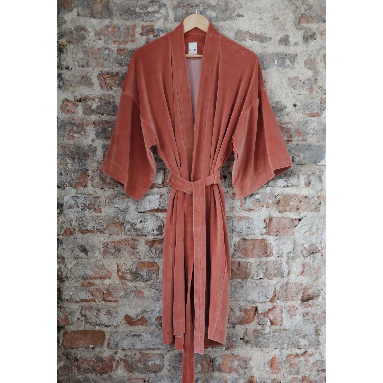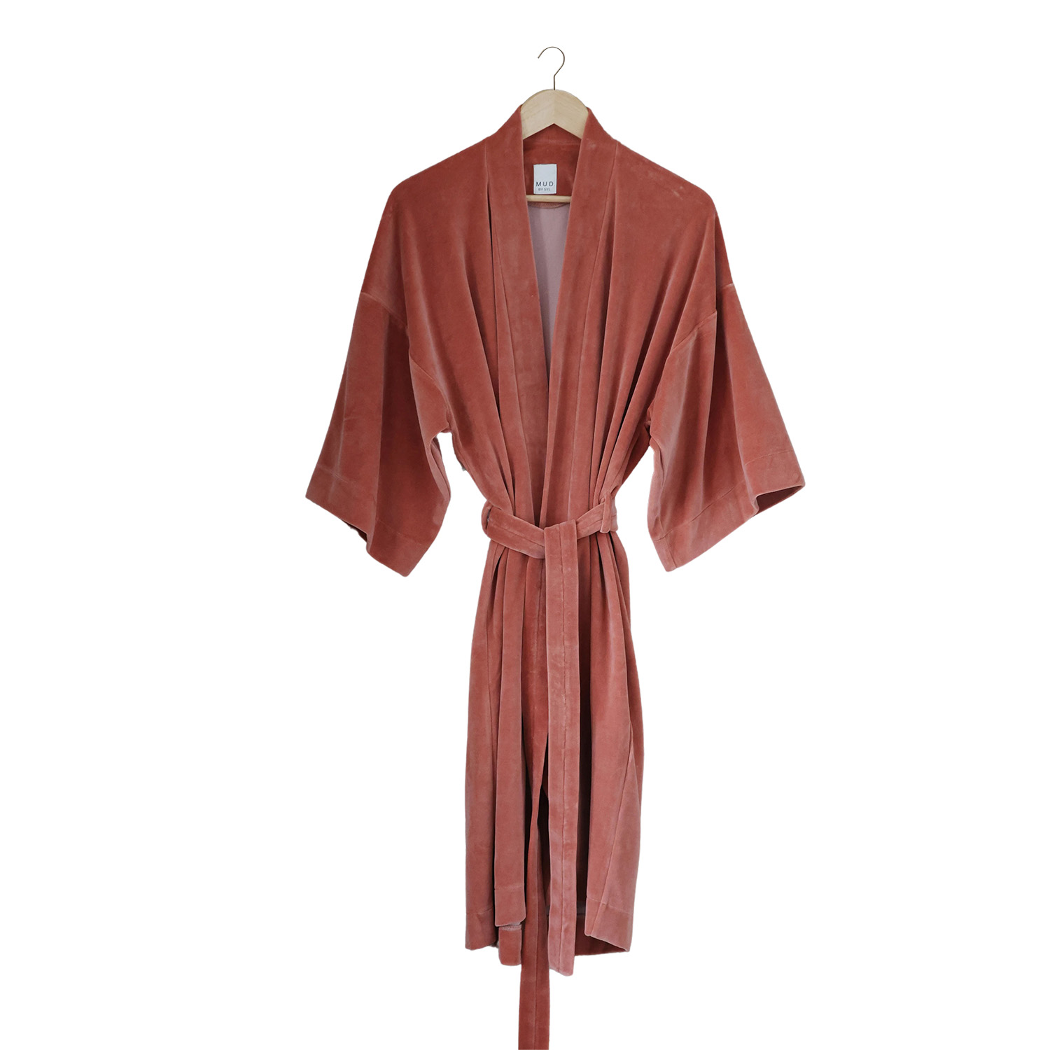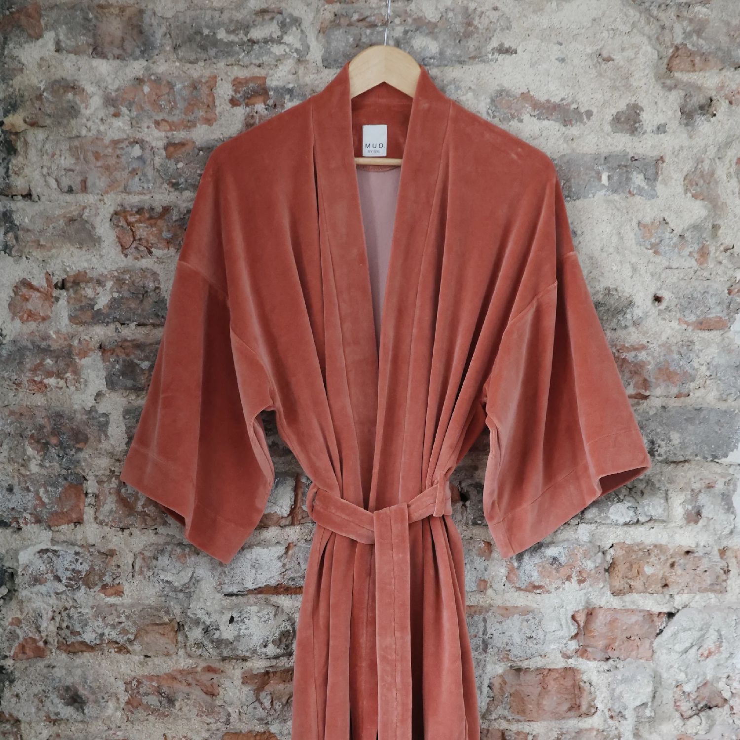 Kimono Terra van Mud by Syl is prachtige korte ochtendjas in een serene kleur geïnspireerd op de wijze aarde. Roze en rood verweven, als eerbetoon aan de natuur en harmonie. Ervaar de luxe zachtheid en comfort van cotton velvet, een materiaal gemaakt van een hoogwaardig gerecyclede katoen. Deze elegante kimono heeft een prachtige sluike pasvorm met een brede bies bij de hals en sluit met een ceintuur van het zelfde materiaal. De kimono heeft een wijde kimonomouw op 3/4 lengte.