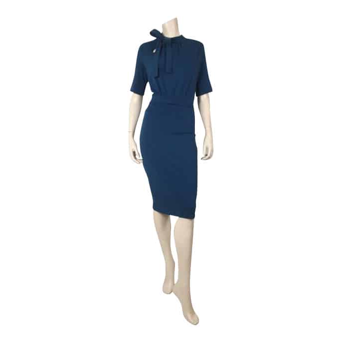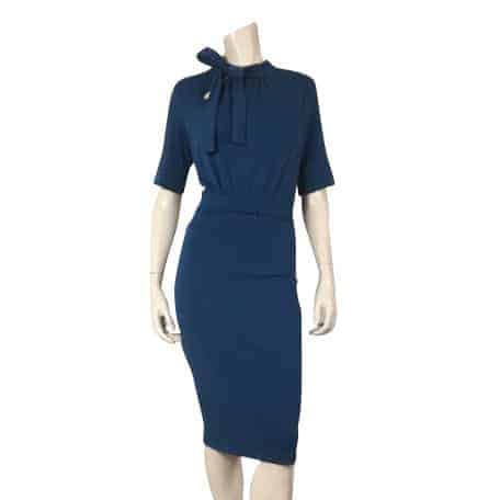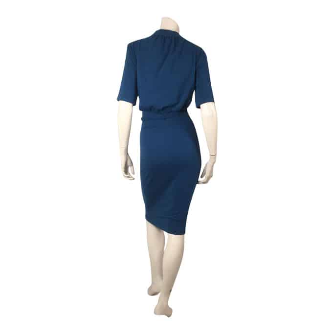 Deze charmante, beetje sexy jurk in petrolblauw, heeft een omslagmouw, een druppelvormig split bij de hals en een brede strikhals. Het rokdeel loopt naar de knieen toe smaller. De zogenaamde potloodrok of ook wel pencilskirt.