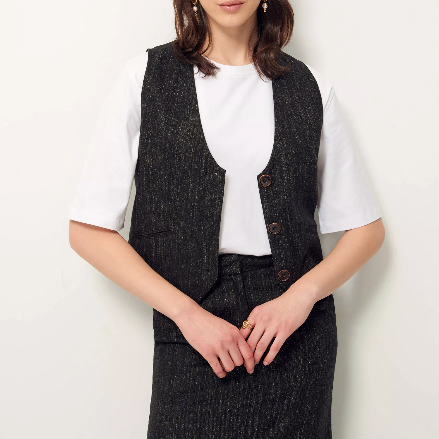 Voorzien van een verborgen ritssluiting met knoop en haak en staafje in de taille, schuine zakken en paspelzakken aan de achterzijde, waarvan één met knoop.