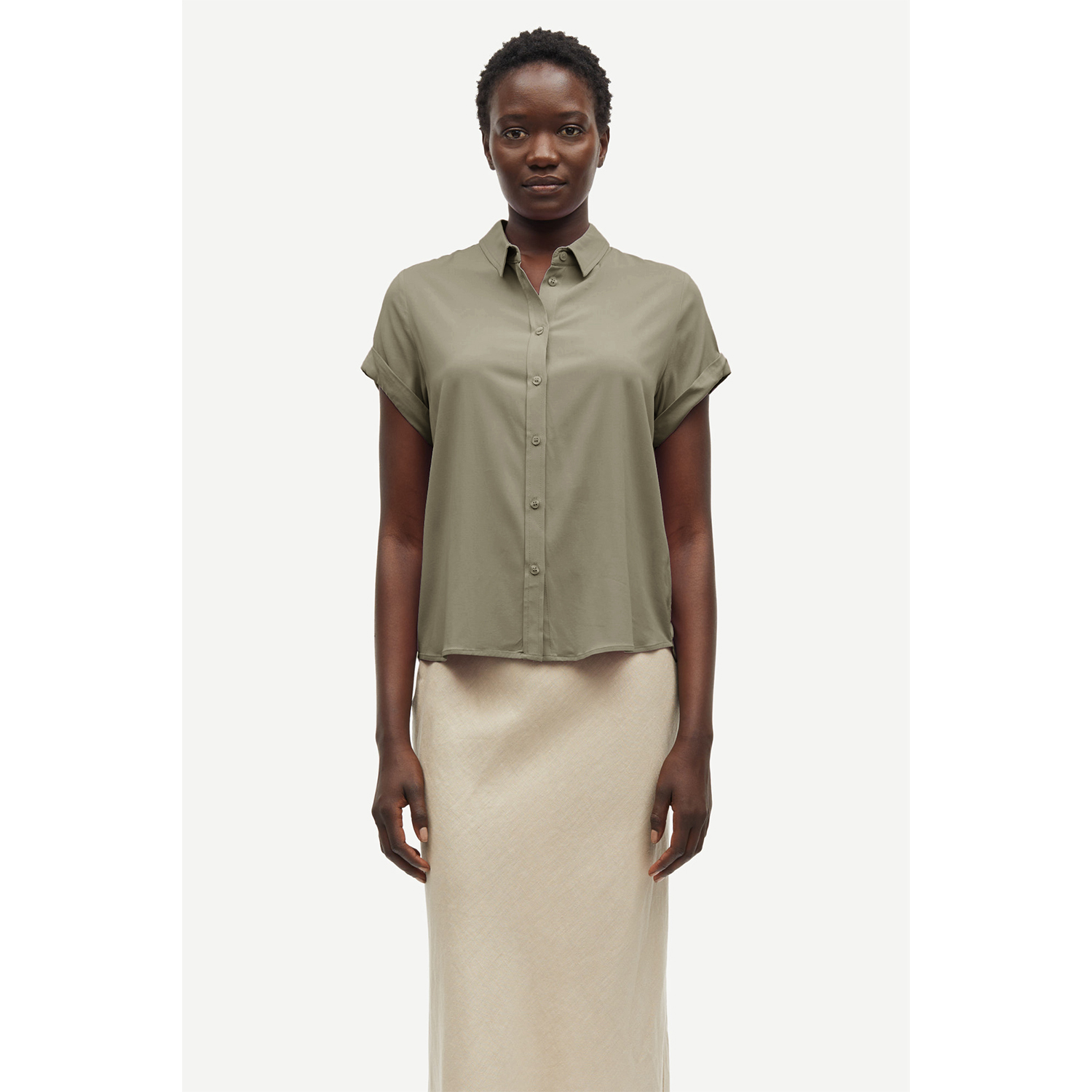 Het Majan Shirt in de kleur Vetiver, van het label Samsøe Samsøe. Dit overhemd met korte mouwen heeft een regular fit en knoopsluiting aan de voorkant. De achterkant is langer dan de voorkant en het heeft een klassieke overhemdkraag. De geplooide details bij de schouderpas geven net dat beetje extra flair. De Majan blousetop is zowel stijlvol als relaxed!