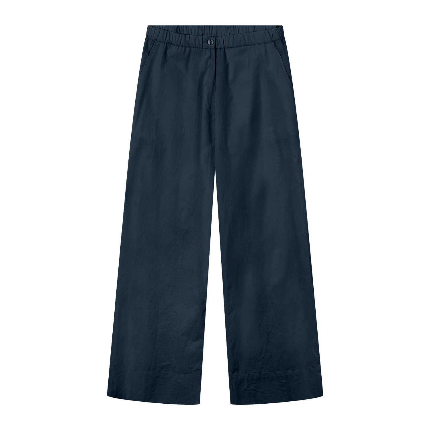 De Maple Pants in de kleur Navy van het duurzame Nederlandse label Alchemist. De wijde, rechte pijpen vallen soepel langs het lichaam en eindigen in brede zomen, die doen denken aan een culotte-stijl. De iets kortere lengte voegt een eigentijds element toe, waardoor ze te combineren zijn met alle soorten schoeisel, van sneakers tot sandalen of hakken.