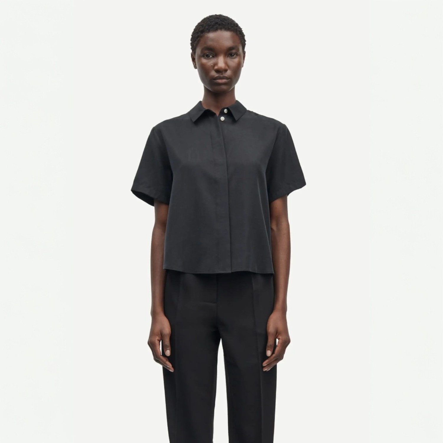 De Mina Short Sleeve shirt in de kleur Black, van het label Samsøe Samsøe is een prachtige blouse met een minimalistische uitstraling. Het shirt in een losse pasvorm met verlaagde schoudernaden is een tijdloze toevoeging aan je garderobe. De blouse sluit met een blinde knoopsluiting aan de voorkant en heeft een elegante schouderpas met verfijnde plooidetails op de rug. Dankzij de luchtige stof van 100% TENCEL™ Lyocell voelt de top heerlijk zacht aan en valt soepel om het lichaam. Een veelzijdige blouse die moeiteloos te combineren is met zowel casual als geklede looks.