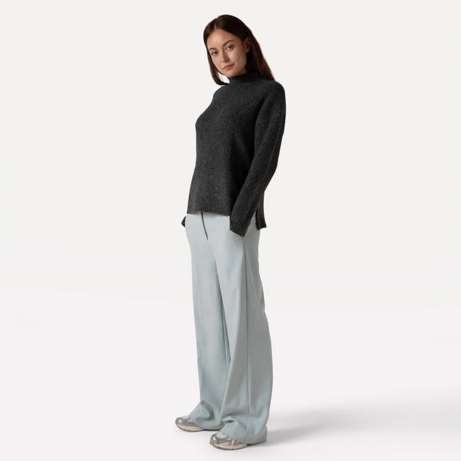 Moore Pants in de kleur Winter Sky, van het label Another Label. Deze lange broek met wijde pijpen heeft een taillebandsluiting met gulp en ritssluiting. De stof is een zware viscosemix. Aan de achterzijde zitten twee neppe broekzakken. De broek heeft een wijdere pasvorm, dus hij is een klein beetje oversized. Als je een getailleerde look wilt, raden wij aan om een maat kleiner te bestellen.