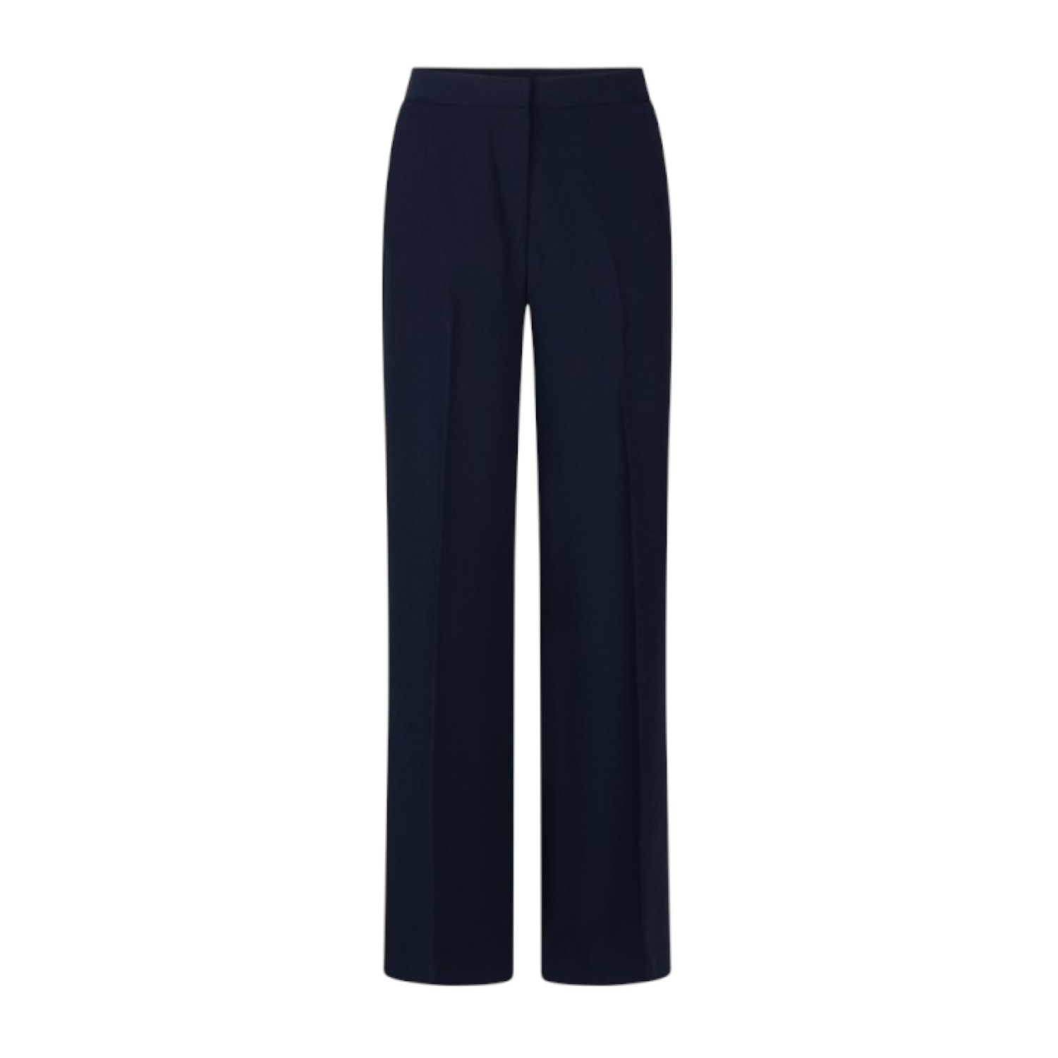 De Nadine Pants in de kleur Night Sky, van het label Another Label. Deze high-waisted broek met rechte, licht wijde pijpen heeft een taillebandsluiting met gulp en ritssluiting. De stof is gemaakt van gecertificeerd Lyocell, een duurzame kwaliteit met een luxe uitstraling. Aan de achterzijde zit een enkele neppe paspelzak. De broek heeft een vrouwelijke, iets losvallende pasvorm met plooien aan de voor- en achterkant die zorgen voor een elegante, gestroomlijnde look.