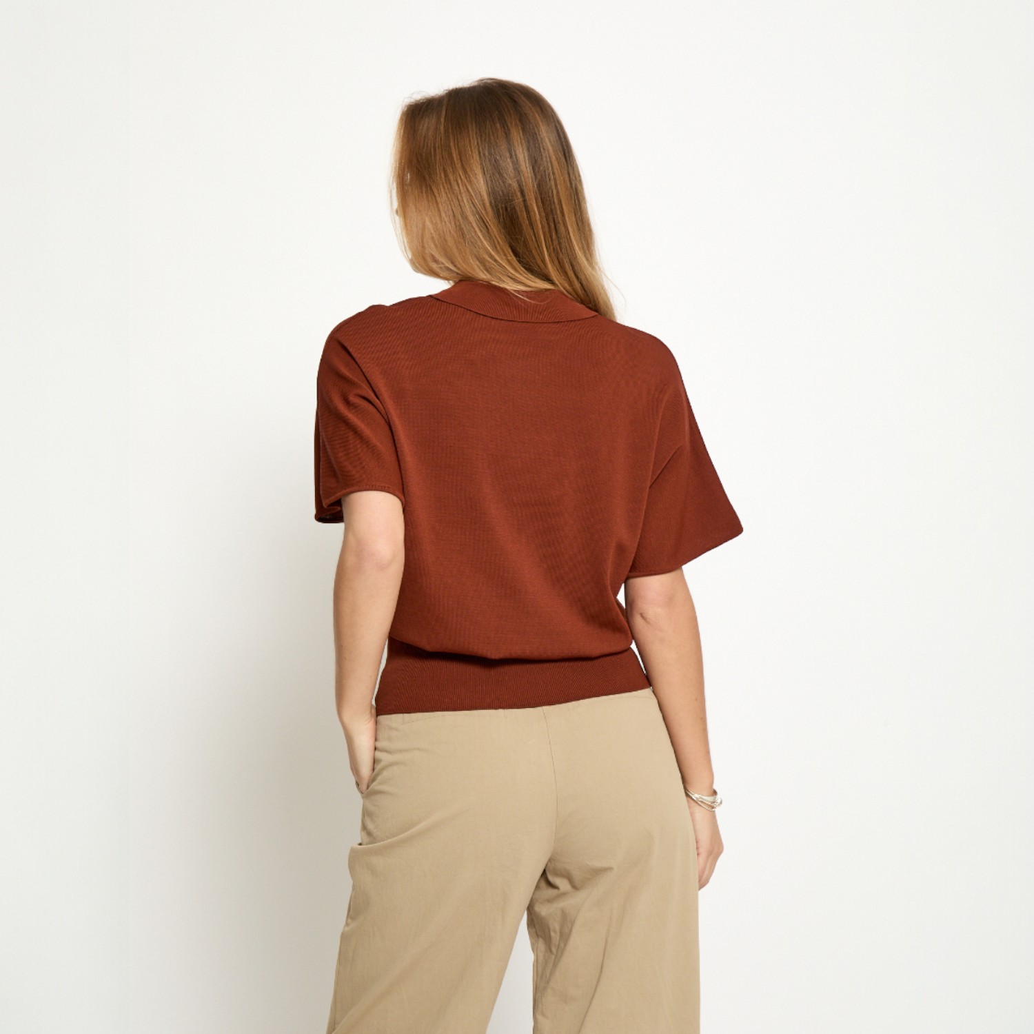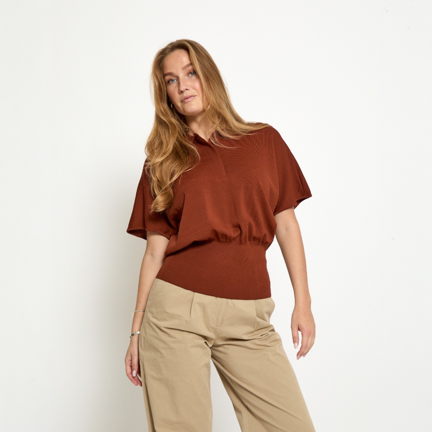 De Naia Polo Top is eenvoudig te combineren binnen verschillende outfits. Draag de top op een jeans voor een ontspannen outfit of combineer met een pantalon of rok voor een meer geklede uitstraling. De warme kleur laat zich mooi combineren met neutrale tinten zoals beige, off-white en zwart.