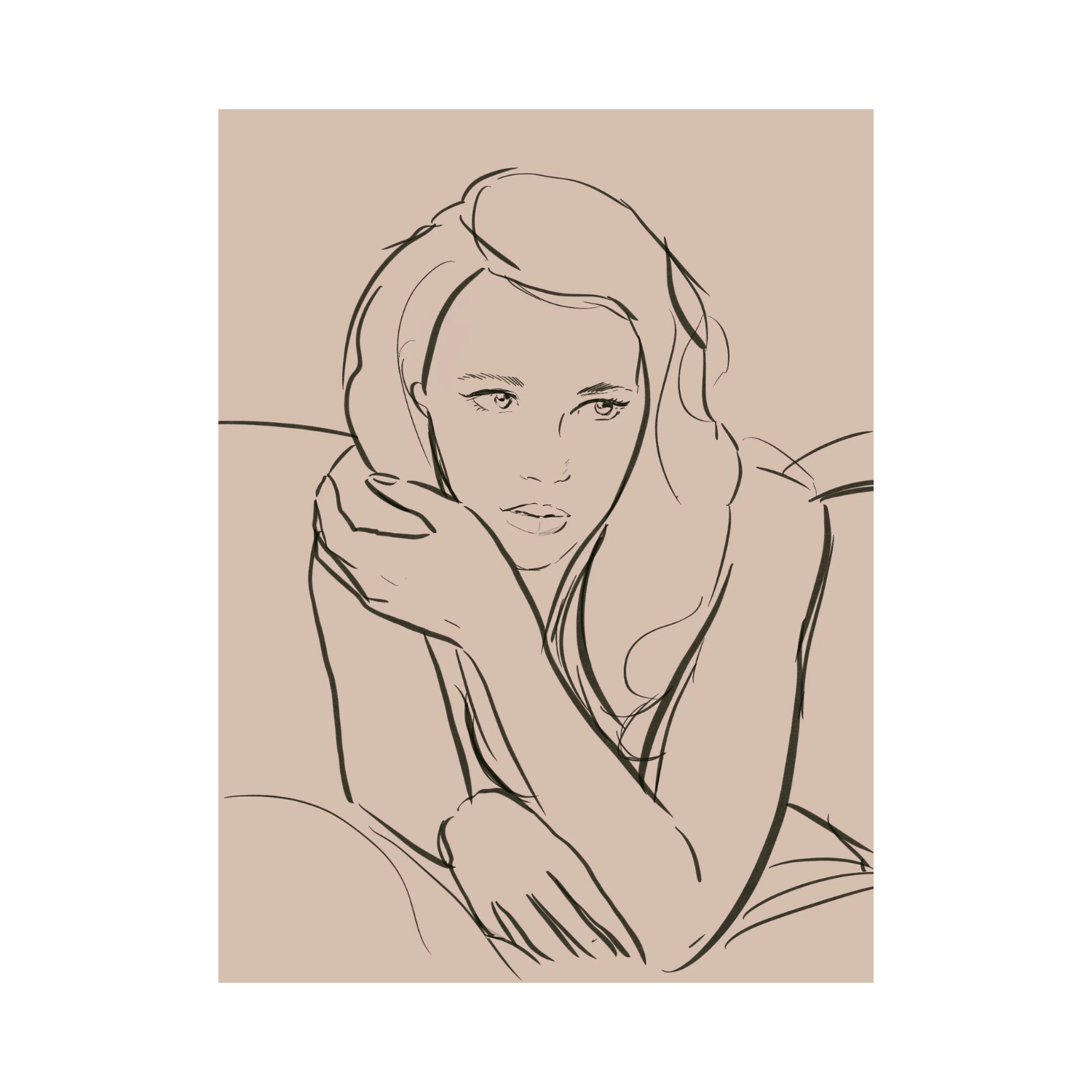 deze ingetogen illustratie van Studio Veldman toont een vrouw die ontspannen op een bank zit, haar lichaam licht naar voren gebogen en haar blik direct, maar zacht. De losse, bijna schetsmatige lijnen geven het beeld een open en eerlijke uitstraling. Zonder kleurvlakken of decoratieve elementen ligt de nadruk volledig op houding en expressie, waardoor de illustratie puur en tijdloos aanvoelt.