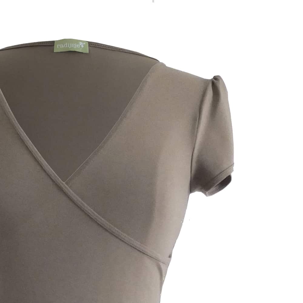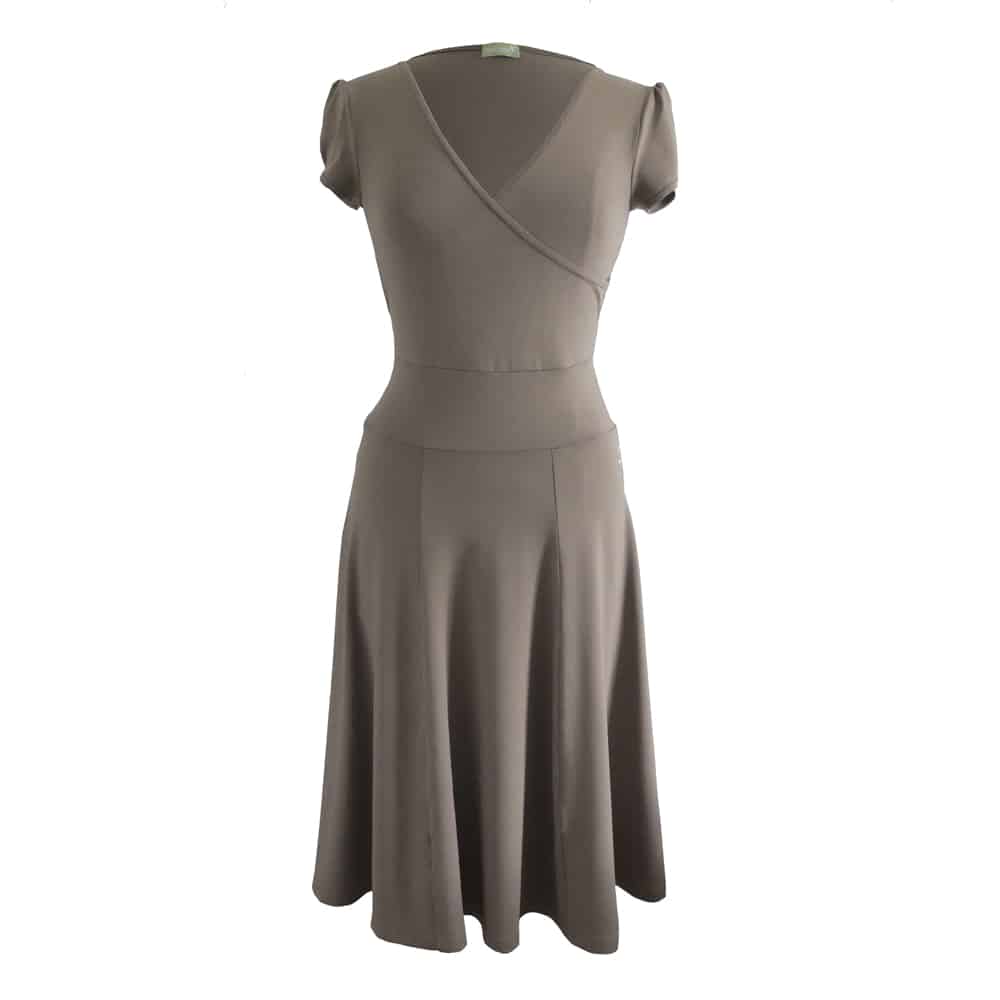 Vrouwelijke overslag jurk met een aangesloten taille in een licht kaki kleur. 6-Baans rok tot over de knie en pofmouwtje. Dit is een model wat prachtig staat als je een smalle taille hebt. De V-hals is vrij diep, dus je draagt er nog een topje onder.