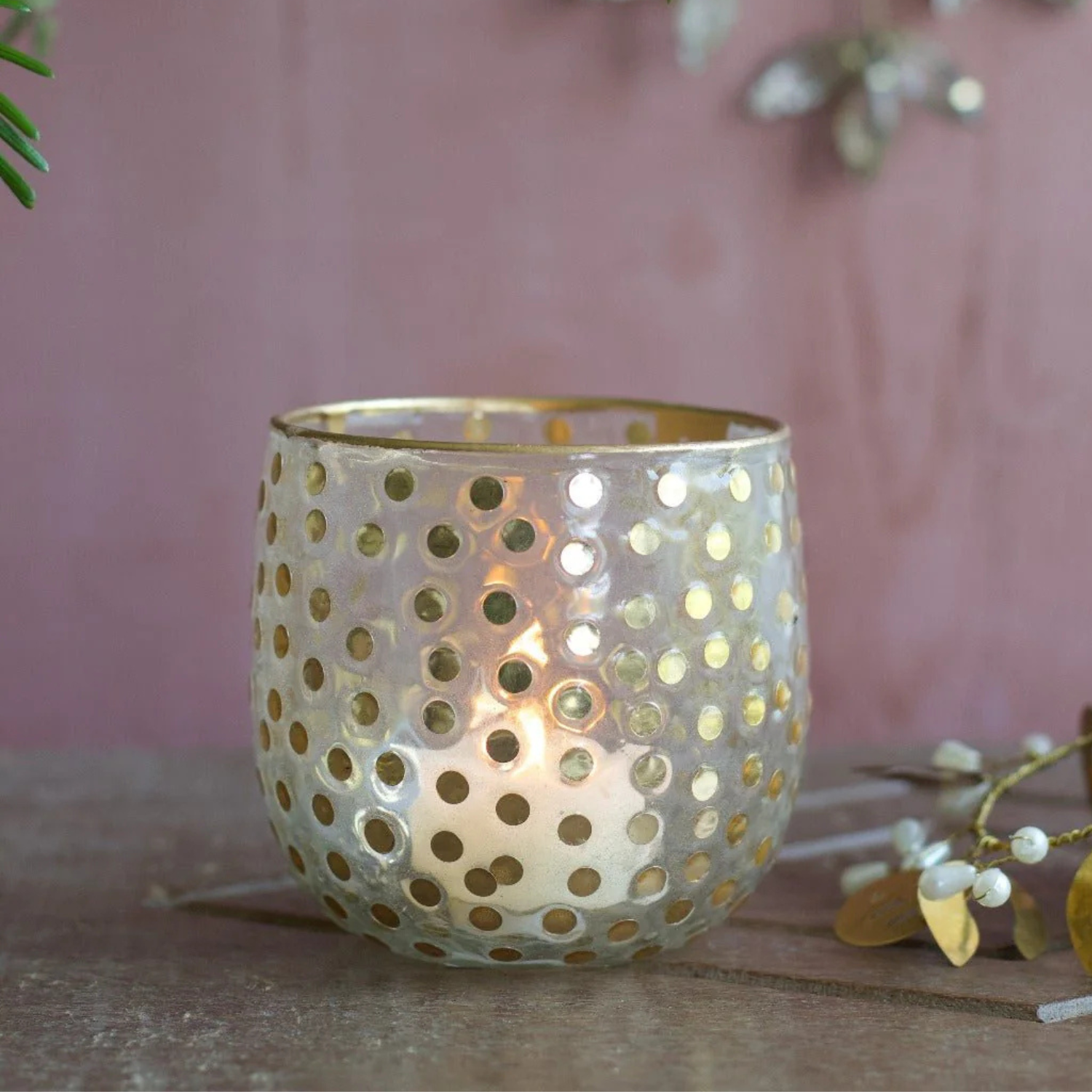 Theelichtje met gouden stippen.