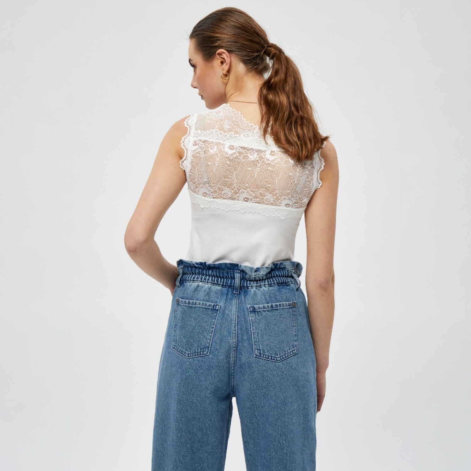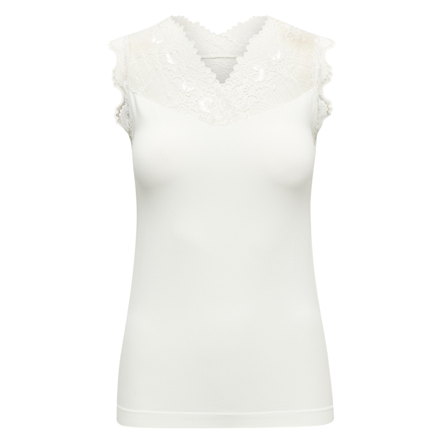 De Vanessa V-Neck Sleeveless Lace Top in de kleur wit is een prachtige mouwloze top van het Deense label Minus met een kanten bovenkant. Door de aangesloten pasvorm kun je deze top goed onder een trui, jurk of een open jasje dragen.