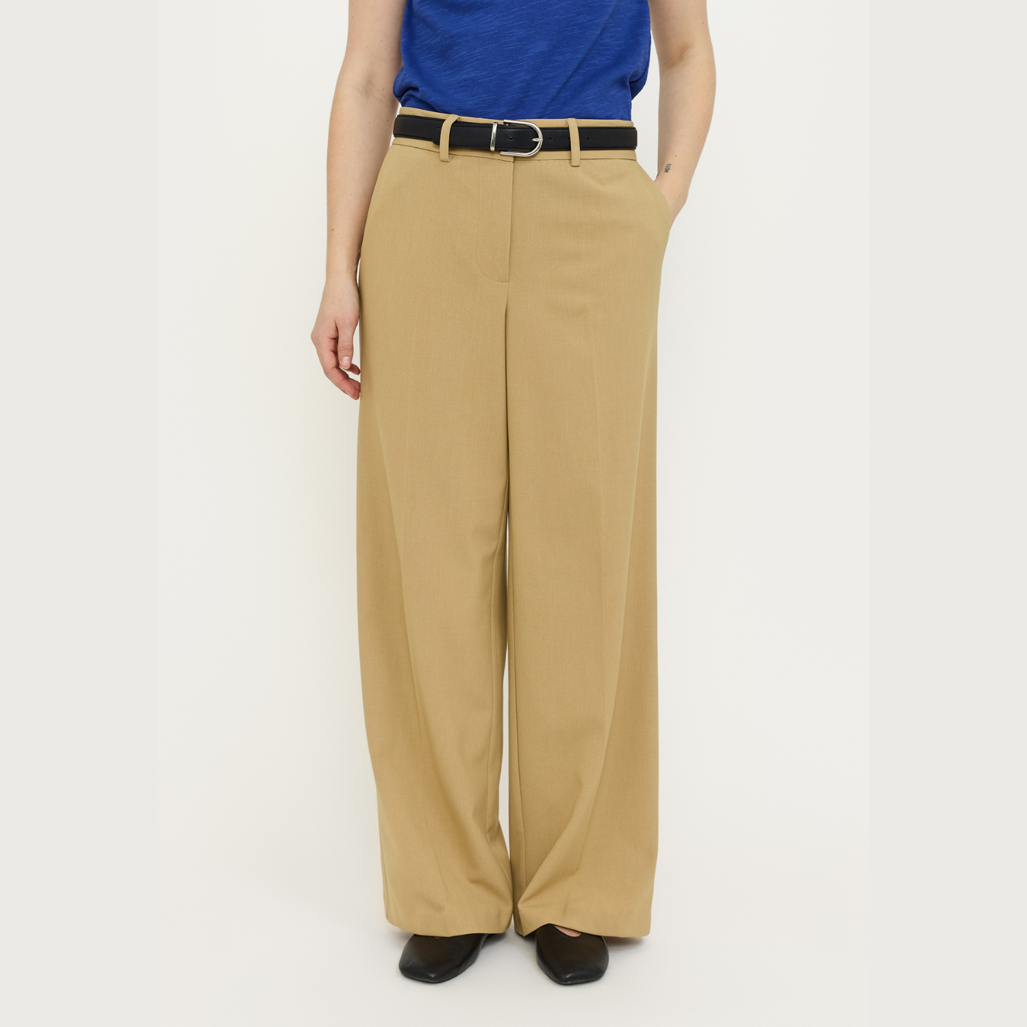 Beige pantalon met wijde pijpen die moeiteloos elegantie en draagcomfort samenbrengt.