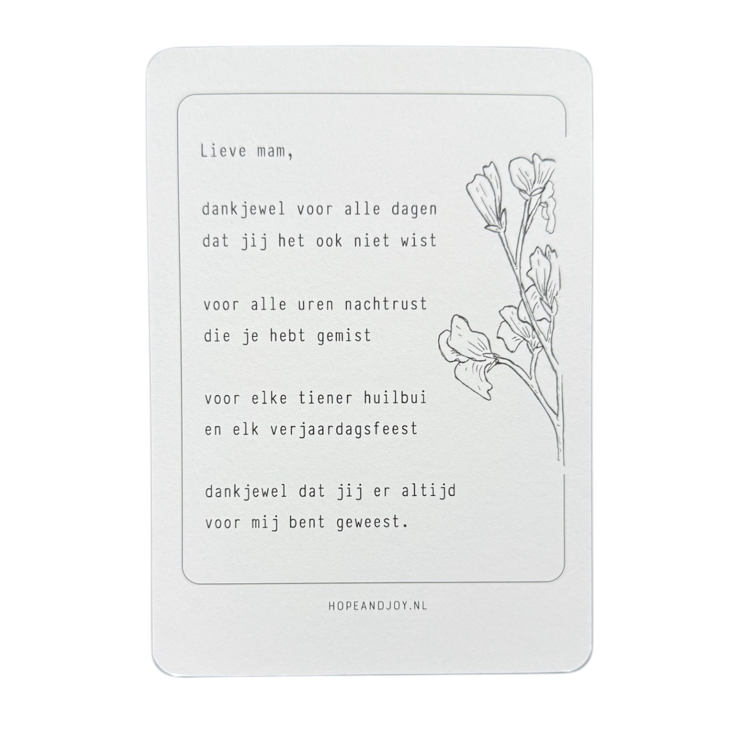 Voor lieve moeders, postkaart met gedicht van het Zutphense label Hope & Joy.