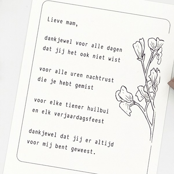 Maak je moeder of bonus-, pleeg-, of schoonmoeder blij met deze mooie kaart met een lief gedicht.