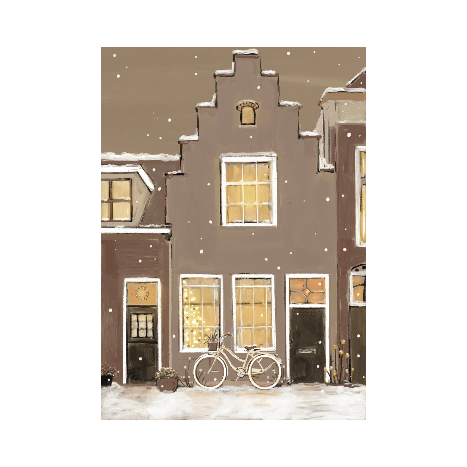 Deze sfeervolle illustratie van Studio Veldman toont een rustig straatbeeld waarin warmte en winter samen lijkten te komen. Een karakteristiek huis met trapgevel staat centraal, de ramen zacht verlicht terwijl buiten de sneeuw rustig naar beneden dwarrelt. Voor de deur staat een fiets, alsof hij daar even is achtergelaten na een thuiskomst in de kou. De combinatie van architectonische lijnen, warme lichtaccenten en vallende sneeuw maakt dit beeld levendig en verstild tegelijk.
